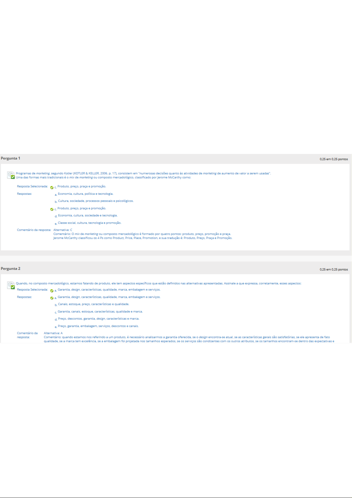 Pergunta 1 0,25 em 0,25 pontos Programas de marketing, segundo Kotler (KOTLER & KELLER, 2006. 17), consistem em "numerosas decisões quanto às atividades de marketing de aumento de valor a serem usadas". Uma das formas mais tradicionais é mix de marketing ou composto mercadológico, classificado por Jerome McCarthy como: Resposta Selecionada: Produto, preço, praça e promoção. Respostas: a. Economia, cultura, política e tecnologia. b. Cultura, sociedade, processos pessoais e psicológicos. Produto, preço, praça e promoção. d. Economia, cultura, sociedade e tecnologia. e. Classe social, cultura, tecnologia e promoção. Comentário da resposta: Alternativa: Comentário: mix de marketing ou composto mercadológico é formado por quatro pontos: produto, preço, promoção e praça. Jerome McCarthy classificou os 4 Ps como Price, Place, Promotion, e sua tradução é: Produto, Preço, Praça e Promoção. Pergunta 2 0,25 em 0,25 pontos Quando, no composto mercadológico, estamos falando de produto, ele tem aspectos específicos que estão definidos nas alternativas apresentadas. Assinale a que expressa, corretamente, esses aspectos: Resposta Selecionada: a. Garantia, design, características, qualidade, marca, embalagem e serviços. Respostas: a. Garantia, design, características, qualidade, marca, embalagem e serviços. b. Canais, estoque, preço, características e qualidade. Garantia, canais, estoque, características, qualidade e marca. d. Preço, descontos, garantia, design, características e marca. e. Preço, garantia, embalagem, serviços, descontos e canais. Comentário da Alternativa: A resposta: Comentário: quando estamos nos referindo a um produto, é necessário analisarmos a garantia oferecida, se design encontra-se atual, se as características gerais são satisfatórias, se ele apresenta de fato qualidade, se a marca tem excelência, se a embalagem foi projetada nos tamanhos esperados, se os serviços são condizentes com os outros atributos, se os tamanhos encontram-se dentro das expectativas ePergunta 3 0,25 em 0,25 pontos É possível aplicarmos mix de produtos, estabelecido por ao marketing pessoal a fim de podermos enaltecer aspectos da personalidade, da formação e da nossa própria vida, que possam se tornar efetivos diferenciais. Assinale nas alternativas qual é a que traz aspectos do mix que diz respeito ao produto, dentro do marketing pessoal: Resposta Selecionada: e. Todas as alternativas anteriores estão corretas. Respostas: a. Estamos nos referindo a características pessoais que profissional tem para oferecer como valor. b. Formação, qualidade, conhecimento e conteúdo. C. Competências, habilidades e atitudes. d. Comportamentos, competências e imagem. e. Todas as alternativas anteriores estão corretas. Comentário da Alternativa: E resposta: Comentário: formação, qualidade, conhecimento, conteúdo, competências, habilidades, atitudes, comportamentos, competências e imagem são retrato de um produto quando estamos nos referindo ao marketing pessoal. Pergunta 4 0,25 em 0,25 pontos Ainda quando estamos falando de composto mercadológico e nos referimos à promoção, estamos falando de: Resposta Selecionada: d. Somente as alternativas "a" e "b" estão corretas. Respostas: a. Propaganda e promoção. b. Relações públicas e marketing direto. Força de vendas, marketing direto e serviços. d. Somente as alternativas "a" e "b" estão corretas. e. As alternativas "a", "b" e "c" estão corretas. Comentário da resposta: Alternativa: D Comentário: serviços não fazem parte do item promoção, dentro do mix mercadológico.Pergunta 5 0,25 em 0,25 pontos A formação é fundamental como valor, porque só conseguimos ser eficientes se soubermos a exata maneira de desenvolver trabalhos que nos são pertinentes e quanto mais eficientes, maior a possibilidade de atingirmos a eficácia e criarmos um diferencial efetivo. Portanto, é correto afirmarmos que: - Com a frase anterior, estamos nos referindo a competências. A frase anterior diz respeito a planejamentos. III A frase não tem qualquer ligação com processos desenvolvidos dentro das competências pessoais. Resposta Selecionada: a. Somente a alternativa está correta. Respostas: a. Somente a alternativa está correta. b. Somente a alternativa está correta. C. Somente a alternativa III está d. As alternativas e estão corretas. e. As alternativas e III estão corretas. Comentário da resposta: Alternativa: A Comentário: a formação, fundamental como valor, diz respeito às competências individuais. Pergunta 6 0,25 em 0,25 pontos Comportamento pode ser definido como a relação do ser com seu mundo, com ambiente em que vive, que pode vir a modificá-lo ou ser por ele modificado. Sendo assim, é correto afirmamos que: Resposta Selecionada: e. Comportamento diz respeito a todas as alternativas anteriores e isso se reflete em como enfrentamos e nos relacionamos com a vida e com os outros. Respostas: a. Comportamento é a interação, através das atitudes que temos no dia a dia, que fazem parte da nossa formação e da nossa personalidade. b. Comportamento quer seja no ambiente familiar, corporativo, político, social, retrata quem somos. Comportamento, na verdade, retrata quem queremos ser. d. Comportamento envolve princípios, valores, ética. e. Comportamento diz respeito a todas as alternativas anteriores e isso se reflete em como enfrentamos e nos relacionamos com a vida e com os outros. Comentário da resposta: Alternativa: E Comentário: de fato, todas as alternativas nos trazem características de comportamento.Pergunta 7 0,25 em 0,25 pontos Sabemos que processo de comunicação transmite sempre uma mensagem, que é constituída de um conjunto de sinais (ou signos) pertencentes a um código linguístico ou não. Essa mensagem utiliza canais de comunicação, que são meio pelo qual a mensagem será transmitida e que serve de suporte físico à transmissão da mensagem. Diante disso, s