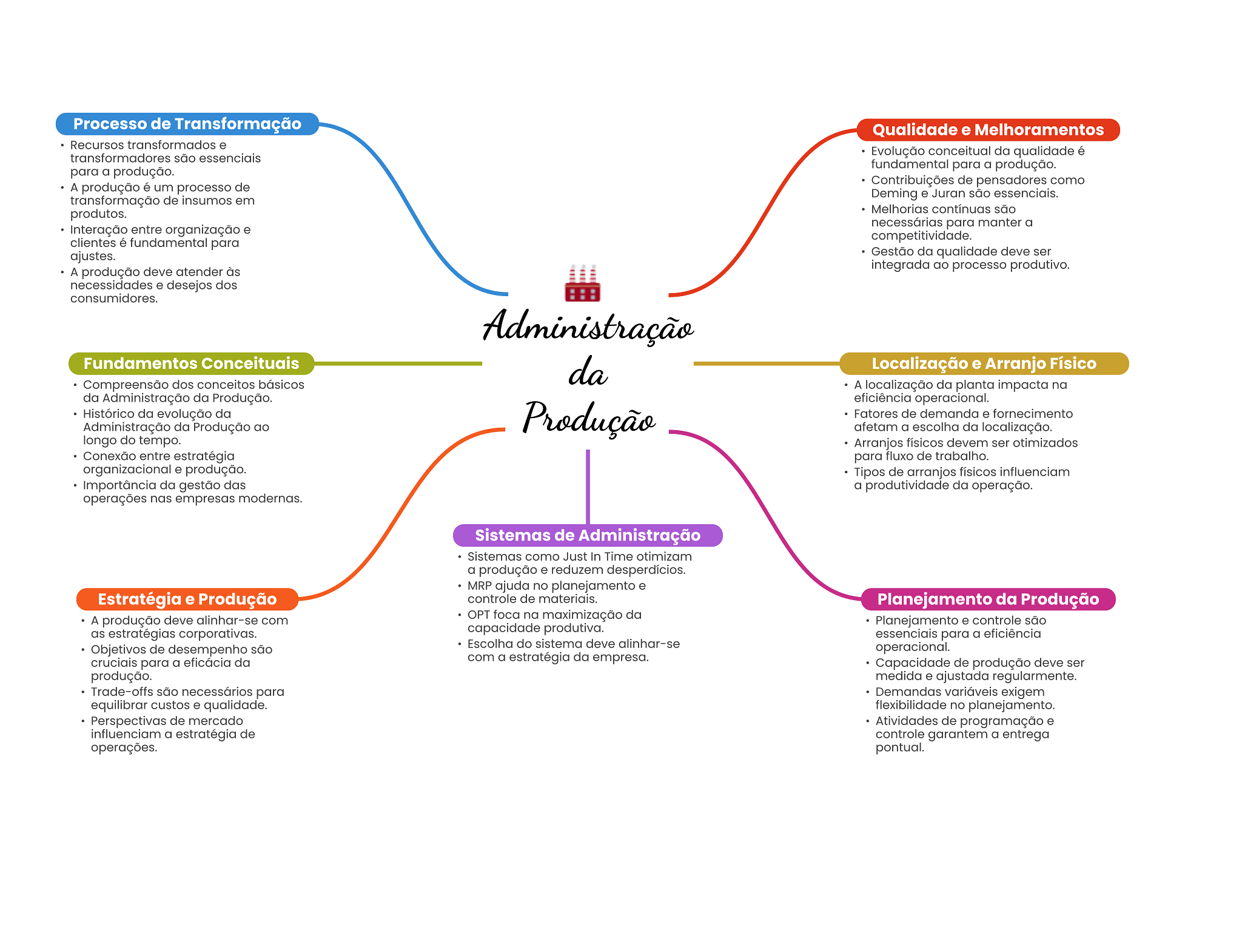 Processo de Transformação Qualidade e Melhoramentos Recursos transformados e transformadores são essenciais Evolução conceitual da qualidade é fundamental para a produção. para a produção. Contribuições de pensadores como A produção é um processo de transformação de insumos em Deming e Juran são essenciais. produtos. Melhorias contínuas são necessárias para manter a Interação entre organização e competitividade. clientes é fundamental para ajustes. Gestão da qualidade deve ser A produção deve atender às integrada ao processo produtivo. necessidades e desejos dos consumidores. Administração Fundamentos Conceituais da Localização e Arranjo Físico Compreensão dos conceitos básicos A localização da planta impacta na da Administração da Produção. eficiência operacional. Histórico da evolução da Produção Fatores de demanda e fornecimento Administração da Produção ao afetam a escolha da localização. longo do tempo. Arranjos físicos devem ser otimizados Conexão entre estratégia para fluxo de trabalho. organizacional e produção. Tipos de arranjos físicos influenciam Importância da gestão das a produtividade da operação. operações nas empresas modernas. Sistemas de Administração Sistemas como Just In Time otimizam a produção e reduzem desperdícios. MRP ajuda no planejamento e Estratégia e Produção controle de materiais. Planejamento da Produção A produção deve alinhar-se com OPT foca na maximização da Planejamento e controle são as estratégias corporativas. capacidade produtiva. essenciais para a eficiência Escolha do sistema deve alinhar-se Objetivos de desempenho são operacional. cruciais para a eficácia da com a estratégia da empresa. Capacidade de produção deve ser produção. medida e ajustada regularmente. Trade-offs são necessários para Demandas variáveis exigem equilibrar custos e qualidade. flexibilidade no planejamento. Perspectivas de mercado Atividades de programação e influenciam a estratégia de controle garantem a entrega operações. pontual.