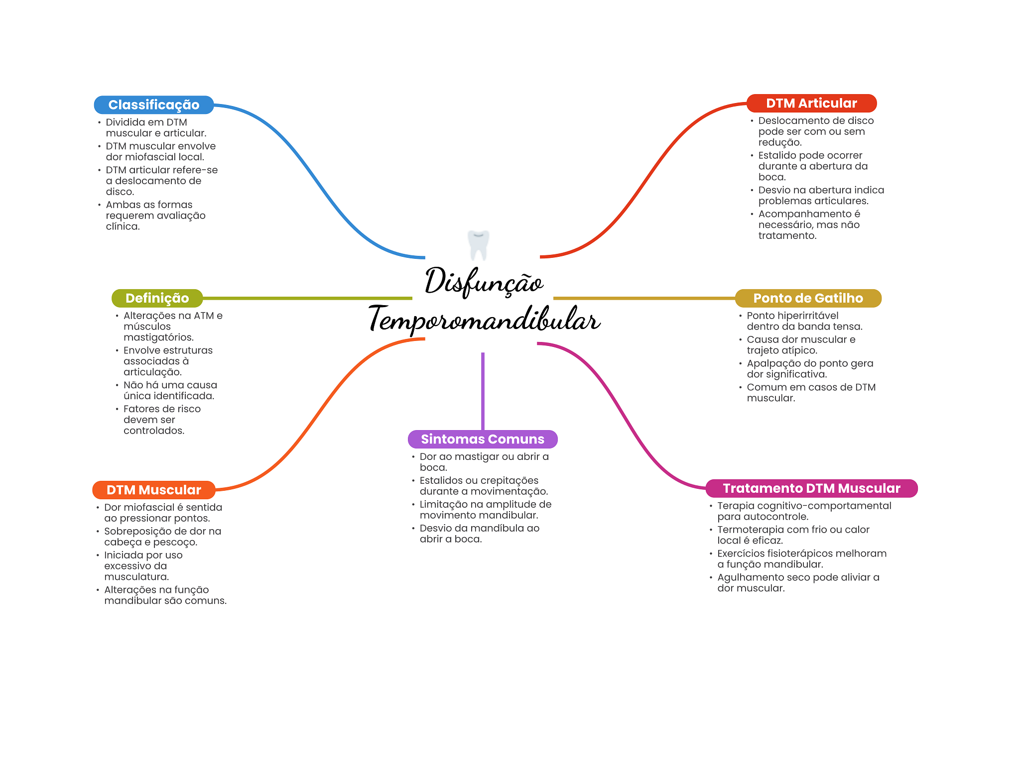 Classificação DTM Articular Dividida em DTM Deslocamento de disco muscular e articular. pode ser com ou sem DTM muscular envolve redução. dor miofascial local. Estalido pode ocorrer DTM articular refere-se durante a abertura da a deslocamento de boca. disco. Desvio na abertura indica Ambas as formas problemas articulares. requerem avaliação Acompanhamento é clínica. necessário, mas não tratamento. Disfunção Definição Ponto de Gatilho Alterações na ATM e músculos Temporomandibular Ponto hiperirritável dentro da banda tensa. mastigatórios. Causa dor muscular e Envolve estruturas trajeto atípico. associadas à Apalpação do ponto gera articulação. dor significativa. Não há uma causa Comum em casos de DTM única identificada. muscular. Fatores de risco devem ser controlados. Sintomas Comuns Dor ao mastigar ou abrir a boca. Estalidos ou crepitações DTM Muscular durante a movimentação. Tratamento DTM Muscular Dor miofascial é sentida Limitação na amplitude de Terapia ao pressionar pontos. movimento mandibular. para autocontrole. Sobreposição de dor na Desvio da mandíbula ao Termoterapia com frio ou calor cabeça e pescoço. abrir a boca. local é eficaz. Iniciada por uso Exercícios fisioterápicos melhoram excessivo da a função mandibular. musculatura. Agulhamento seco pode aliviar a Alterações na função dor muscular. mandibular são comuns.