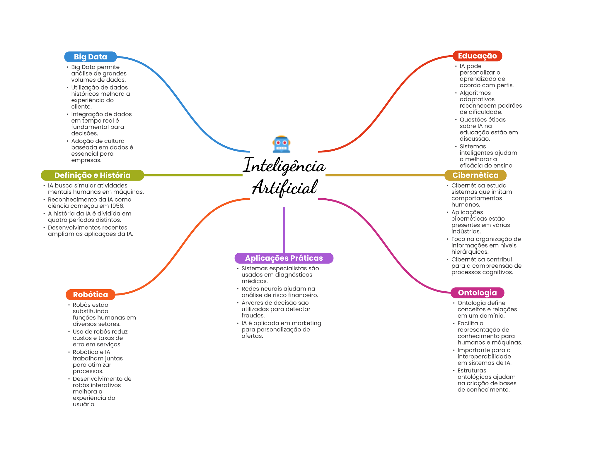 Big Data Educação Big Data permite IA pode análise de grandes personalizar o volumes de dados. aprendizado de Utilização de dados acordo com perfis. históricos melhora a Algoritmos experiência do adaptativos cliente. reconhecem padrões Integração de dados de dificuldade. em tempo real é Questões éticas fundamental para sobre IA na decisões. educação estão em Adoção de cultura discussão. baseada em dados é Sistemas essencial para inteligentes ajudam empresas. a melhorar a Inteligência eficácia do ensino. Definição e História Cibernética IA busca simular atividades mentais humanas em máquinas. Artificial Cibernética estuda sistemas que imitam Reconhecimento da IA como comportamentos ciência começou em 1956. humanos. A história da IA é dividida em Aplicações quatro períodos distintos. cibernéticas estão Desenvolvimentos recentes presentes em várias ampliam as aplicações da IA. indústrias. Foco na organização de informações em níveis hierárquicos. Aplicações Práticas Cibernética contribui Sistemas especialistas são para a compreensão de usados em diagnósticos processos cognitivos. médicos. Redes neurais ajudam na Robótica análise de risco financeiro. Ontologia Robôs estão Árvores de decisão são Ontologia define substituindo utilizadas para detectar conceitos e relações funções humanas em fraudes. em um domínio. diversos setores. IA é aplicada em marketing Facilita a Uso de robôs reduz para personalização de representação de custos e taxas de ofertas. conhecimento para erro em serviços. humanos e máquinas. Robótica e IA Importante para a trabalham juntas interoperabilidade para otimizar em sistemas de IA. processos. Estruturas Desenvolvimento de ontológicas ajudam robôs interativos na criação de bases melhora a de conhecimento. experiência do usuário.