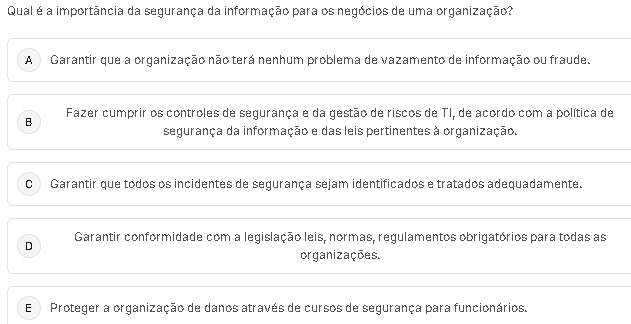 Qual é a da segurança da informação para negocios de uma organização? A Garantir que a organização não tera nenhum problema de vazamento de informação ou fraude. Fazer cumprir os controles de segurança e da gestão de riscos de TI, de acordo com a política de B segurança da informação e das leis pertinentes à organização. C Garantir que todos incidentes de segurança sejam identificados e tratados adequadamente. Garantir conformidade com a legislação leis, normas, regulamentos para todas as D organizações. E Proteger a organização de danos através de cursos de segurança para