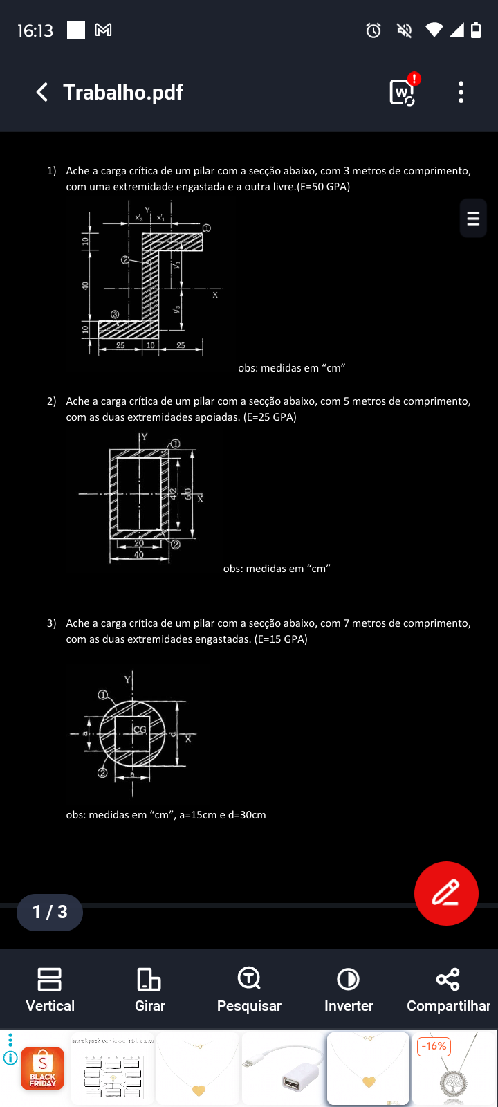 16:13 M Trabalho.pdf W 1) Ache a carga crítica de um pilar com a secção abaixo, com 3 metros de comprimento, com uma extremidade engastada e a outra livre.(E=50 GPA) Y III 1 10 40 X 10 25 10 25 obs: medidas em "cm" 2) Ache a carga crítica de um pilar com a secção abaixo, com 5 metros de comprimento, com as duas extremidades apoiadas. (E=25 GPA) Y 1 X 20 40 obs: medidas em "cm" 3) Ache a carga crítica de um pilar com a secção abaixo, com 7 metros de comprimento, com as duas extremidades engastadas. (E=15 GPA) Y 1 a CG X obs: medidas em "cm", a=15cm e d=30cm 1/3 Vertical Girar Pesquisar Inverter Compartilhar -16% i S BLACK FRIDAY