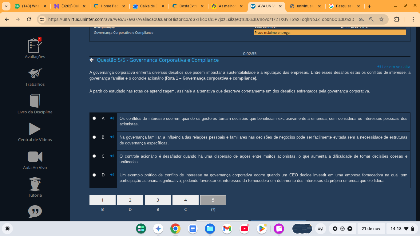 (143) Wha (3262) Ca Home Pag Caixa de E CostaExtr As melho AVA UNIV univirtus X Pesquisa X + Governança Corporativa e Compliance Prazo máximo entrega: 0:02:55 Avaliações Questão 5/5 - Governança Corporativa e Compliance Ler em voz alta A governança corporativa enfrenta diversos desafios que podem impactar a sustentabilidade e a reputação das empresas. Entre esses desafios estão os conflitos de interesse, a governança familiar e controle acionário (Rota 1 Governança corporativa e compliance). Trabalhos A partir do estudado nas rotas de aprendizagem, assinale a alternativa que descreve corretamente um dos desafios enfrentados pela governança corporativa. Livro da Disciplina A Os conflitos de interesse ocorrem quando gestores tomam decisões que beneficiam exclusivamente a empresa, sem considerar interesses pessoais dos acionistas. B Central de Vídeos Na governança familiar, a influência das relações pessoais e familiares nas decisões de negócios pode ser facilmente evitada sem a necessidade de estruturas de governança específicas. C controle acionário é desafiador quando há uma dispersão de ações entre muitos acionistas, 0 que aumenta a dificuldade de tomar decisões coesas e unificadas. Aula Ao Vivo D Um exemplo prático de conflito de interesse na governança corporativa ocorre quando um CEO decide investir em uma empresa fornecedora na qual tem participação acionária significativa, podendo favorecer interesses da fornecedora em detrimento dos interesses da empresa que ele lidera. Tutoria 1 2 3 4 5 " B D (?) :: 21 de nov. 14:18