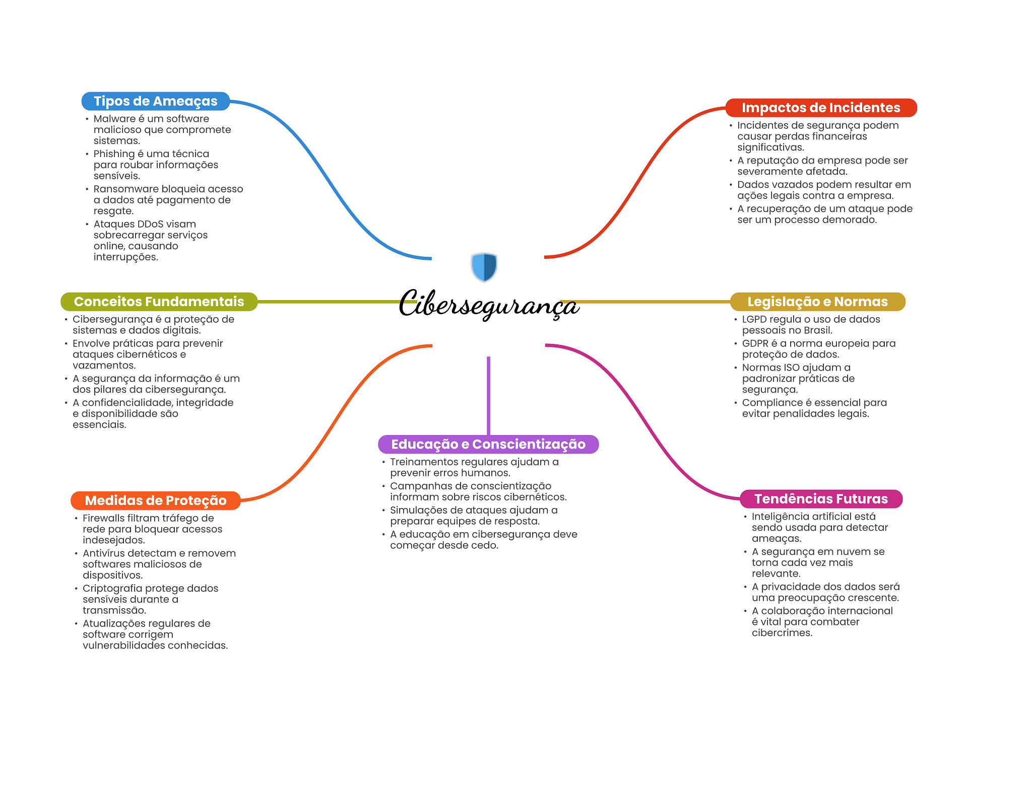 Tipos de Ameaças Impactos de Incidentes Malware é um software malicioso que compromete Incidentes de segurança podem sistemas. causar perdas financeiras significativas. Phishing é uma técnica para roubar informações A reputação da empresa pode ser sensíveis. severamente afetada. Ransomware bloqueia acesso Dados vazados podem resultar em a dados até pagamento de ações legais contra a empresa. resgate. A recuperação de um ataque pode Ataques DDoS visam ser um processo demorado. sobrecarregar serviços online, causando interrupções. Conceitos Fundamentais Cibersegurança Legislação e Normas Cibersegurança é a proteção de LGPD regula uso de dados sistemas e dados digitais. pessoais no Brasil. Envolve práticas para prevenir GDPR é a norma europeia para ataques cibernéticos e proteção de dados. vazamentos. Normas ISO ajudam a A segurança da informação é um padronizar práticas de dos pilares da cibersegurança. segurança. A integridade Compliance é essencial para e disponibilidade são evitar penalidades legais. essenciais. Educação e Conscientização Treinamentos regulares ajudam a prevenir erros humanos. Campanhas de conscientização Medidas de Proteção informam sobre riscos cibernéticos. Tendências Futuras Simulações de ataques ajudam a Firewalls filtram tráfego de preparar equipes de resposta. Inteligência artificial está rede para bloquear acessos sendo usada para detectar indesejados. A educação em cibersegurança deve ameaças. começar desde cedo. detectam e removem A segurança em nuvem se softwares maliciosos de torna cada vez mais dispositivos. relevante. Criptografia protege dados A privacidade dos dados será sensíveis durante a uma preocupação crescente. transmissão. A colaboração internacional Atualizações regulares de é vital para combater software corrigem cibercrimes. conhecidas.