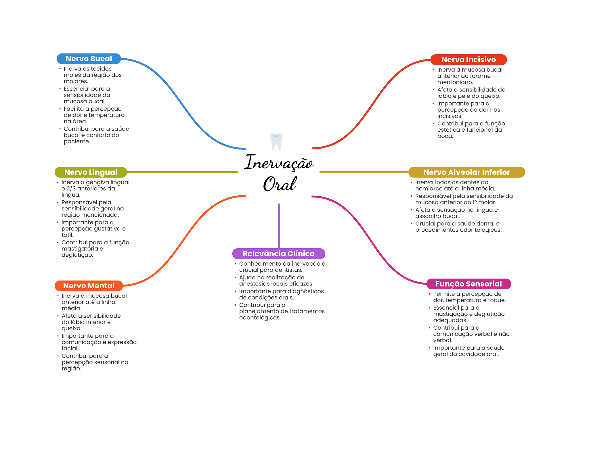 Nervo Bucal Nervo Incisivo Inerva tecidos Inerva a mucosa bucal moles da região dos anterior ao forame molares. mentoniano. Essencial para a Afeta a sensibilidade do sensibilidade da lábio e pele do queixo. mucosa bucal. Importante para a Facilita a percepção percepção da dor nos de dor e temperatura incisivos. na área. Contribui para a função Contribui para a saúde estética e funcional da bucal e conforto do boca. paciente. Inervação Nervo Lingual Nervo Alveolar Inferior Inerva a gengiva lingual e 2/3 anteriores da Oral Inerva todos dentes do hemiarco até a linha média. língua. Responsável pela sensibilidade da Responsável pela mucosa anterior ao 1° molar. sensibilidade geral na Afeta a sensação na língua e região mencionada. assoalho bucal. Importante para a Crucial para a saúde dental e percepção gustativa e procedimentos odontológicos. tátil. Contribui para a função mastigatória e deglutição. Relevância Clínica Conhecimento da inervação é crucial para dentistas. Ajuda na realização de Nervo Mental anestesias locais eficazes. Função Sensorial Importante para diagnósticos Inerva a mucosa bucal Permite a percepção de de condições orais. anterior até a linha dor, temperatura e toque. média. Contribui para O Essencial para a planejamento de tratamentos Afeta a sensibilidade mastigação e deglutição odontológicos. do lábio inferior e adequadas. queixo. Contribui para a Importante para a comunicação verbal e não comunicação e expressão verbal. facial. Importante para a saúde Contribui para a geral da cavidade oral. percepção sensorial na região.