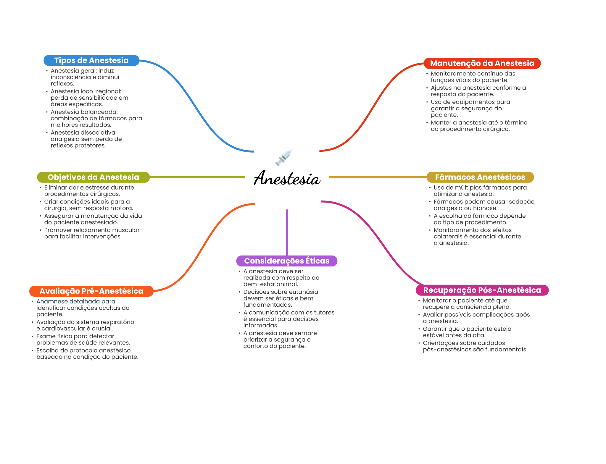 Tipos de Anestesia Manutenção da Anestesia Anestesia geral: induz Monitoramento contínuo das inconsciência e diminui reflexos. funções vitais do paciente. Ajustes na anestesia conforme a Anestesia loco-regional: resposta do paciente. perda de sensibilidade em áreas específicas. Uso de equipamentos para Anestesia balanceada: garantir a segurança do combinação de fármacos para paciente. melhores resultados. Manter a anestesia até término Anestesia dissociativa: do procedimento cirúrgico. analgesia sem perda de reflexos protetores. Objetivos da Anestesia Anestesia Fármacos Anestésicos Eliminar dor e estresse durante Uso de múltiplos fármacos para procedimentos cirúrgicos. otimizar a anestesia. Criar condições ideais para a Fármacos podem causar sedação, cirurgia, sem resposta motora. analgesia ou hipnose. Assegurar a manutenção da vida A escolha do fármaco depende do paciente anestesiado. do tipo de procedimento. Promover relaxamento muscular Monitoramento dos efeitos para facilitar intervenções. colaterais é essencial durante a anestesia. Considerações Éticas A anestesia deve ser realizada com respeito ao bem-estar animal. Avaliação Pré-Anestésica Decisões sobre eutanásia Recuperação Pós-Anestésica devem ser éticas e bem Anamnese detalhada para Monitorar paciente até que fundamentadas. identificar condições ocultas do recupere a consciência plena. paciente. A comunicação com tutores Avaliar possíveis complicações após Avaliação do sistema respiratório é essencial para decisões a anestesia. informadas. e cardiovascular é crucial. Garantir que paciente esteja Exame físico para detectar A anestesia deve sempre estável antes da alta. problemas de saúde relevantes. priorizar a segurança e conforto do paciente. Orientações sobre cuidados Escolha do protocolo anestésico pós-anestésicos são fundamentais. baseado na condição do paciente.
