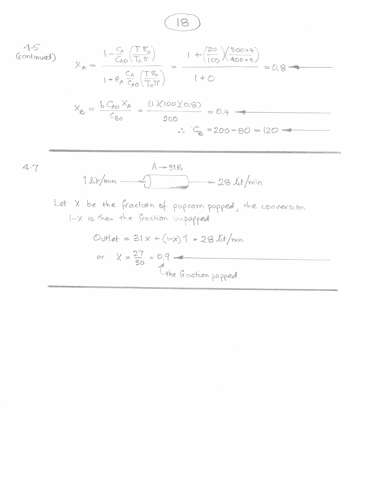 18 4.5 (continued) CA CAO To 400x3 XA = = 0.8 + EA CA CAO 1+0 XB = b CAO CBO XA = (1)(100)(0.8) = 0.4 200 : CB = 200 80 = 120 4.7 A 31R 1 lit/min 28 Let be the fraction of popcorn pupped, the conversion is then the fraction unpopped Outlet = 31 X + 1 = 28 lit/min or = 27 30 = 0.9 fraction popped.