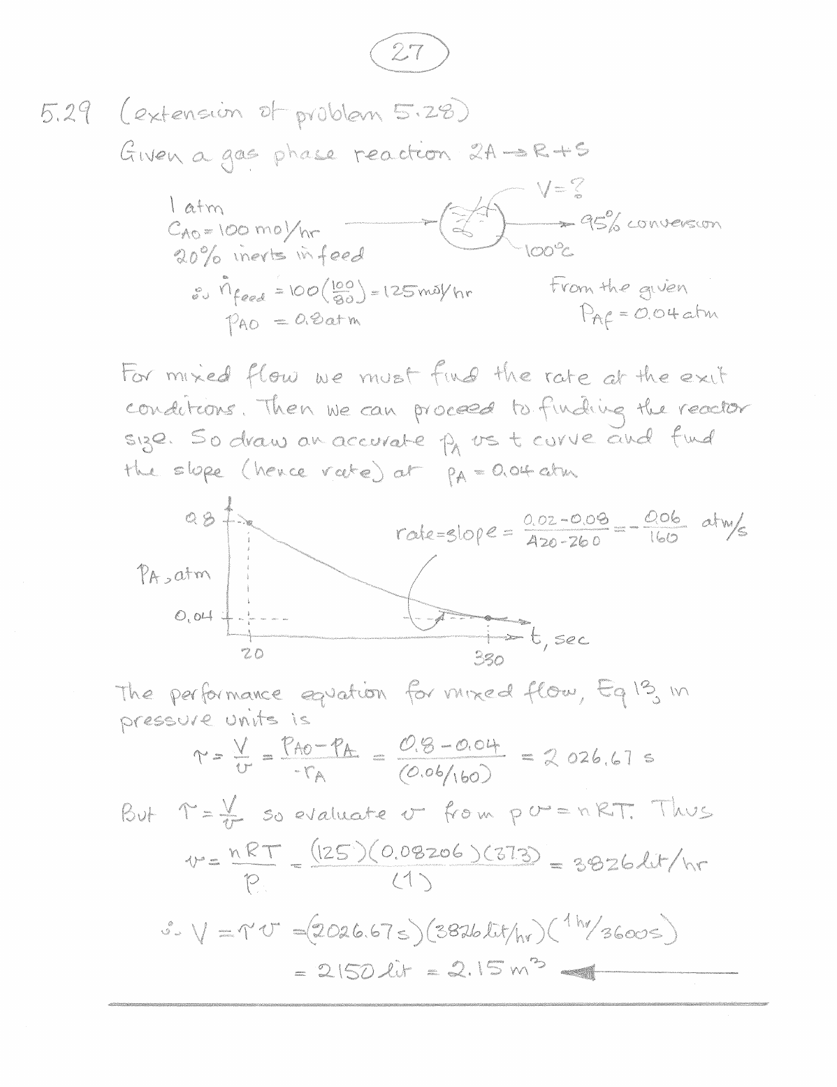 27 5.29 (extension of problem 5.28) Given a gas phase reaction 2A R+S V=? \ atm CAO= = 100 95% conversion 20% inerts in feed = 100(100) = From the given PAO = 0.8atm = For mixed flow we must find the rate at the exit Then can proceed to finding the reactor size. So draw an accurate PA t curve and find the slope (hence rate) at PA = 0,04 atm 0.8 rate=slope = 0.02-0.08 420-260 160 atm/s PA,atm 0,04 t,sec 20 330 The performance equation for mixed flow, Eq 13, in pressure units is V v = PAO-PA = (0.06/160) = -rA But = evaluate from pa Thus = nRT = = 3826lit/hr (1) V = TV = = 2150 lit = 2.15