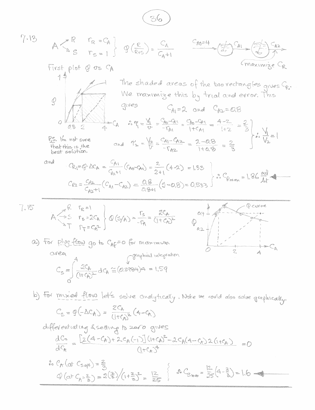 36 7.13 A S rs=1 R = CA+1 CA CA2 = First plot CA maximize CR The shaded areas of the two rectangles gives CR. Q We maximize this by trial and error. This gives CA1=2 and 0.00 2 4 CA = = CAO = 4-2 1+2 = I'm not sure that this is the and T2 = V2 = CA1-CA2 = 2-0.8 1+0.8 = V2 best solution. and = = 2+1 (4-2) = 1.33 : = 1.86 let CR2 = CA2+1 = 0.8+1 = 0,533 7.15 R curve A S rs = 2CA Q (S/A) = rs = 2CA 0.4 T = CA2 0.2 For go to for I A area 2 4 4 graphical integration = 2CA dCA (0,3984)4 = 1.59 b) For mixed flow let's solve Note we could also salve graphically. Cs = (-ACA) 2CA (4-CA) differentiating &setting to zero gives dCs = =0 = CA (at (sopt) = (at CA = = 2 = 12 25