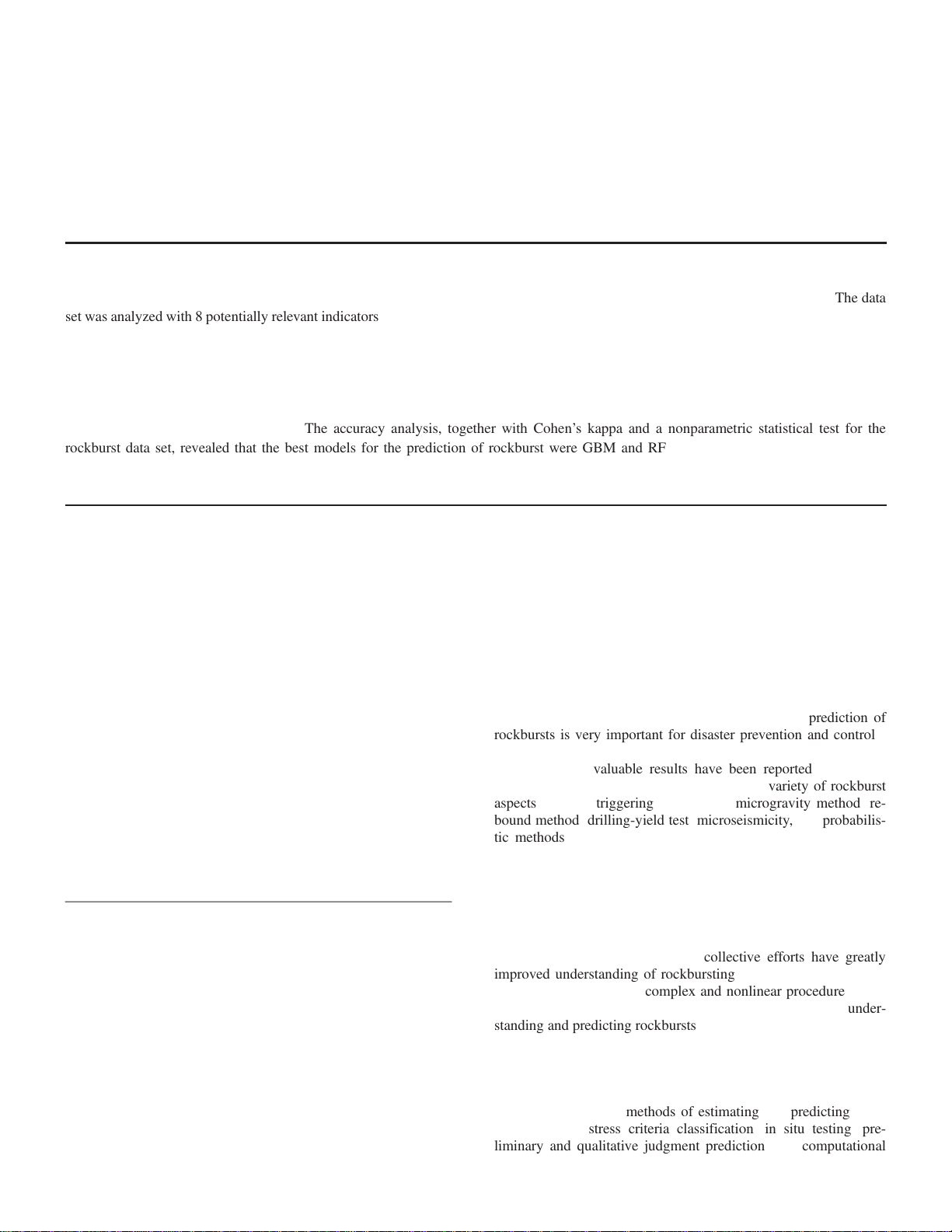 Classification of Rockburst in Underground Projects: Comparison of Ten Supervised Learning Methods Jian Zhou, Ph.D.1; Xibing Li2; and Hani S. Mitri3 Abstract: Rockburst prediction is of crucial importance to the design and construction of many underground projects. Insufficient knowledge, lack of characterizing information, and noisy data restrain rock mechanics engineers from achieving optimal prediction results. In this paper, a data set of 246 rockburst events was examined for rockburst classification using supervised learning (SL) methods. The data set was analyzed with 8 potentially relevant indicators. Eleven algorithms from 10 categories of SL algorithms were evaluated for their ability to learn rockburst, including linear discriminant analysis (LDA), quadratic discriminant analysis (QDA), partial least-squares discriminant analysis (PLSDA), naïve Bayes (NB), k-nearest neighbor (KNN), multilayer perceptron neural network (MLPNN), classification tree (CT), support vector machine (SVM), random forest (RF), and gradient-boosting machine (GBM). The data set was randomly split into two parts: training (70%) and test (30%). A 10-fold cross-validation (CV) method was applied during modeling, and an external testing set was employed to validate the prediction performance of the SL models. Two accuracy measures for multiclass problems were employed: classification rate and Cohen’s Kappa. The accuracy analysis, together with Cohen’s kappa and a nonparametric statistical test for the rockburst data set, revealed that the best models for the prediction of rockburst were GBM and RF when compared with other learning algorithms. DOI: 10.1061/(ASCE)CP.1943-5487.0000553. © 2016 American Society of Civil Engineers. Author keywords: Underground project; Rockburst; Supervised learning; Classification; Cross-validation; Nonparametric statistical test. Introduction Rockburst is a dynamic, spontaneous, uncontrolled geological dis- aster that occurs in underground structures such as mines, hydro- power caverns, and tunnels (Ortlepp 1997; Wang and Park 2001; Zhou et al. 2012). The occurrence of rockbursting is attributed to the release of accumulated energy in the rock in a violent manner (Cook et al. 1966; Kaiser et al. 1997; Blake and Hedley 2003). Because rockbursts occur suddenly and intensely, rock particles can be ejected with a velocity of 8–50 m=s (Ortlepp 1993); they usually cause considerable damage to infrastructure and/or equip- ment and may even cause fatal injuries (Ortlepp 2005; Zhou et al. 2012). Many hard rockburst–prone mines in China, Canada, South Africa, the United States, Australia, Sweden, and other countries, as well as some deep buried civil tunnels in Switzerland, China, and Peru, have suffered from rockbursts to various degrees. For exam- ple, in 1960 a rockburst in the Witwatersrand Mines in South Africa caused 435 deaths; this was the worst accident in South African mining history (Durrheim 2010). In China, according to incomplete statistics from the period 2001–2007, many deep-mine hazards due to rockburst were re- ported, accompanied by more than 13,000 accidents and at least 16,000 casualties (Zhou et al. 2012). Zhang et al. (2012a) reported an extremely intense rockburst that occurred in the drainage tunnel of the Jinping II Hydropower Station at a depth of 2,330 m in 2009. It caused seven deaths and one injury, as well as complete destruc- tion of the tunnel boring machine (TBM). Nowadays, rock exca- vations can reach great depths, and with increasing mining activities worldwide, the problem of rockbursting is likely to get worse (Shi et al. 2010; Li et al. 2011b). Thus, the prediction of rockbursts is very important for disaster prevention and control. Although it is very difficult to accurately predict rockburst dur- ing excavation, valuable results have been reported in the past several decades by a number of authors on a variety of rockburst aspects, such as triggering mechanism, microgravity method, re- bound method, drilling-yield test, microseismicity, and probabilis- tic methods (Zhang and Fu 2008; Zhou et al. 2012). Extensive rockburst research has been conducted in South Africa, Canada, Australia, China, and many other countries (Ortlepp 2005). In par- ticular, since their inception in Johannesburg in 1982 the symposia on rockbursts and seismicity in mines (RaSiM) have provided a platform for the exchange of information on both practical and fun- damental aspects of rockbursts and seismicity-related problems (Ortlepp 2005; Cai 2013). These collective efforts have greatly improved understanding of rockbursting. Rockburst classification prediction, however, is a complex and nonlinear procedure that is influenced by model and parameter uncertainty. Therefore, under- standing and predicting rockbursts are still considerable challenges for underground projects. Considerable research effort in South Africa, Australia, Canada, and China has been devoted to understanding the rockburst phenomenon (Ortlepp 2005; Potvin 2009; Zhou et al. 2012). As pointed out, different methods of estimating and predicting rock- burst, such as stress criteria classification, in situ testing, pre- liminary and qualitative judgment prediction, and computational 1School of Resources and Safety Engineering, Central South Univ., #932 Lushan South Rd., Changsha 410083, China; Visiting Scholar, Dept. of Mining and Materials Engineering, McGill Univ., 3450 University St., Montreal, QC, Canada H3A 0E8 (corresponding author). E-mail: csujzhou@hotmail.com 2Professor, School of Resources and Safety Engineering, Central South Univ., #932 Lushan South Rd., Changsha 410083, China. E-mail: xbli@ mail.csu.edu.cn 3Professor, Dept. of Mining and Materials Engineering, McGill Univ., 3450 University St., Montreal, QC, Canada H3A 0E8. E-mail: hani.mitri@ mcgill.ca Note. This manuscript was submitted on April 24, 2015; approved on September 30, 2015; published online on January 6, 2016. Discussion pe