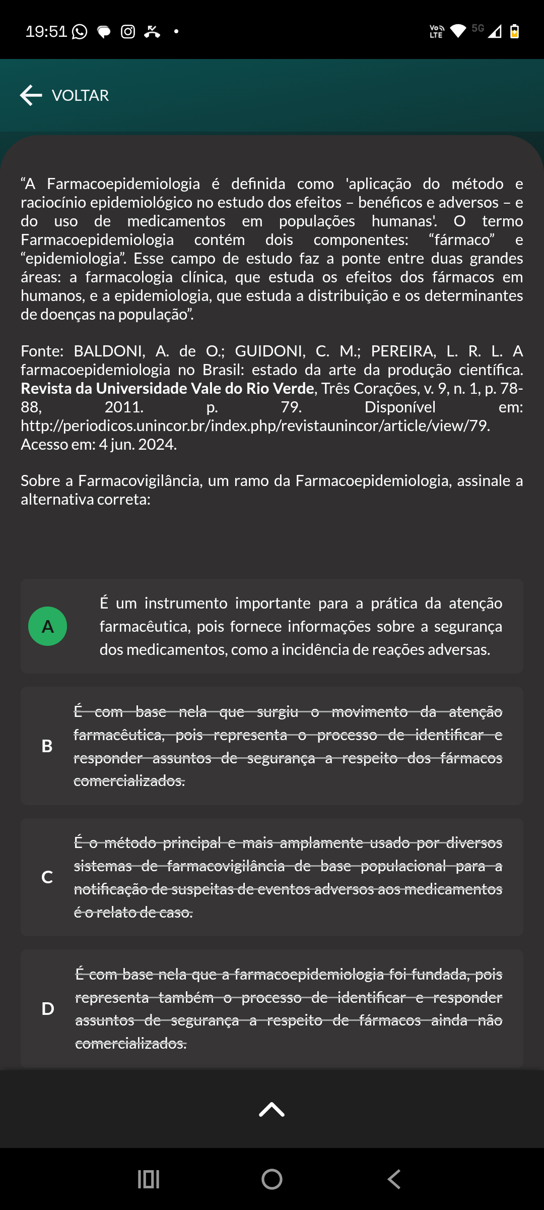 19:51 5G LTE VOLTAR "A Farmacoepidemiologia é definida como 'aplicação do método e raciocínio epidemiológico no estudo dos efeitos benéficos e adversos e do uso de medicamentos em populações humanas'. termo Farmacoepidemiologia contém dois componentes: "fármaco" e "epidemiologia". Esse campo de estudo faz a ponte entre duas grandes áreas: a farmacologia clínica, que estuda os efeitos dos fármacos em humanos, e a epidemiologia, que estuda a distribuição e os determinantes de doenças na população". Fonte: BALDONI, de GUIDONI, PEREIRA, L. R. L. A farmacoepidemiologia no Brasil: estado da arte da produção científica. Revista da Universidade Vale do Rio Verde, Três Corações, v.9, n. 1, p. 78- 88, 2011. p. 79. Disponível em: http://periodicos.unincor.br/index.php/revistaunincor/article/view/79 Acesso em: 4 jun. 2024. Sobre a Farmacovigilância, um ramo da Farmacoepidemiologia, assinale a alternativa correta: É um instrumento importante para a prática da atenção A farmacêutica, pois fornece informações sobre a segurança dos medicamentos, como a incidência de reações adversas. É com base nela que surgiu movimento da atenção farmacêutica, pois representa processo de identificar e responder assuntos de segurança a respeito dos fármacos comercializados. É método principal e mais amplamente usado por diversos sistemas de farmacovigilância de base populacional para a c notificação de suspeitas de eventos adversos aos medicamentos éo relato de caso. É com base nela que a farmacoepidemiologia foi fundada, pois representa também processo de identificar e responder D assuntos de segurança a respeito de fármacos ainda não comercializados.