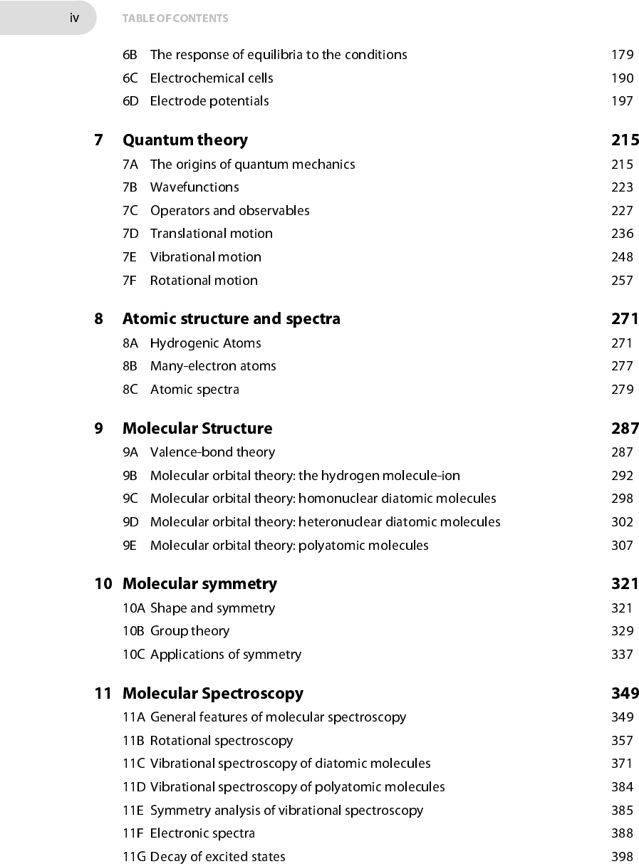 iv TABLE OF CONTENTS 6B The response of equilibria to the conditions 179 6C Electrochemical cells 190 6D Electrode potentials 197 7 Quantum theory 215 7A The origins of quantummechanics 215 7B Wavefunctions 223 7C Operators and observables 227 7D Translational motion 236 7E Vibrational motion 248 7F Rotational motion 257 8 Atomic structure and spectra 271 8A Hydrogenic Atoms 271 8B Many-electron atoms 277 8C Atomic spectra 279 9 Molecular Structure 287 9A Valence-bond theory 287 9B Molecular orbital theory: the hydrogen molecule-ion 292 9C Molecular orbital theory: homonuclear diatomic molecules 298 9D Molecular orbital theory: heteronuclear diatomic molecules 302 9E Molecular orbital theory: polyatomic molecules 307 10 Molecular symmetry 321 10A Shape and symmetry 321 10B Group theory 329 10C Applications of symmetry 337 11 Molecular Spectroscopy 349 11A General features of molecular spectroscopy 349 11B Rotational spectroscopy 357 11C Vibrational spectroscopy of diatomic molecules 371 11D Vibrational spectroscopy of polyatomic molecules 384 11E Symmetry analysis of vibrational spectroscopy 385 11F Electronic spectra 388 11G Decay of excited states 398