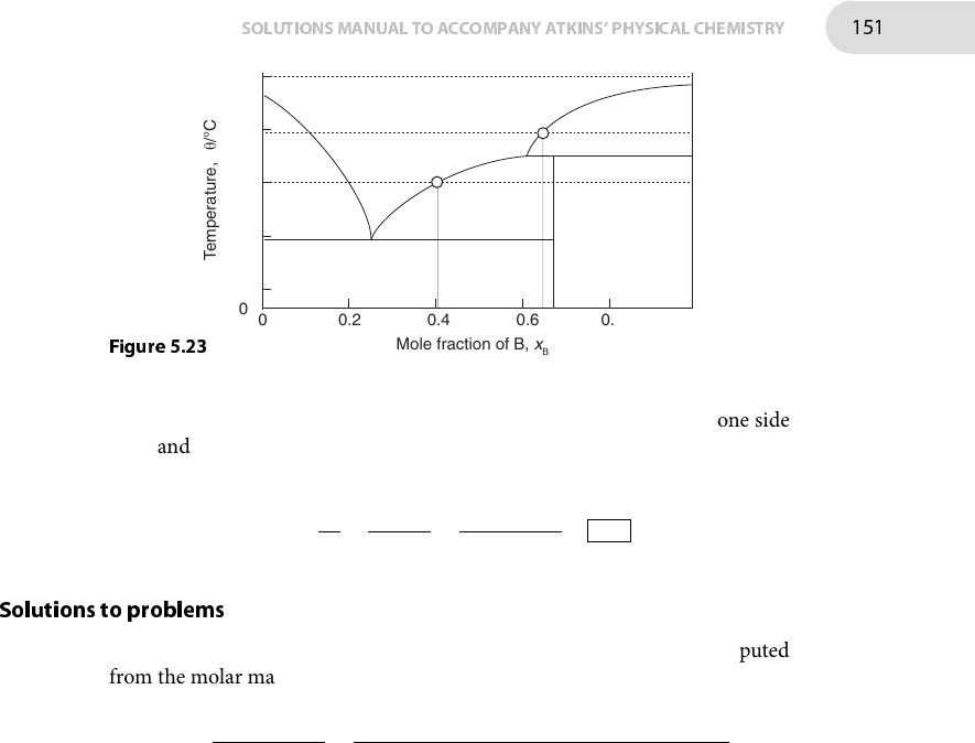 SOLUTIONSMANUAL TO ACCOMPANY ATKINS' PHYSICAL CHEMISTRY 151 T e m p e ra tu re , θ /° C Mole fraction of B, x B 0 0 0.2 0.4 0.6 0.8 1 500 400 300 T 1 T 2200 100 x 1 x 2 Figure 5.23 �is relationship is rearranged and terms in nc are collected on one side and those in na on the other to give nax2 = nc(2 − 3x2). �e mole ratio of compound to free A is given by nc na = x2 2 − 3x2 = 0.41 2 − 3 × 0.41 = 0.53 Solutions to problems P5D.2 �e mole fraction of sulfur, xS, corresponding to compound PnSm is computed from the molar masses of sulfur and phosphorus,MS andMP, as xS = mMS mMS + nMP = m × (32.06 gmol−1) m × (32.06 gmol−1) + n × (30.97 gmol−1) Using this expression, mole fractions corresponding to the three compounds are: (1) P4S3, 0.44; (2) P4S7, 0.64; (3) P4S10, 0.72. �e phase diagram is a variation of that shown in Fig. 5D.4 on page 178 except that instead of one compound being formed there are three.�e diagram there- fore separates into four sections, as shown schematically in Fig. 5.24. Note that no information is given on the temperature or composition of the eutectics, so these have simply been selected arbitrarily. �e diagram has four eutectics labelled e1, e2, e3, and e4; eight two-phase liquid-solid regions, t1 through t8; and four two-phase solid regions, S1, S2, S3, and S4.�e composition and physical state of the regions are as follows: l: liquid S and P S1: solid P and solid P4S3 S2: solid P4S3 and solid P4S7 S3: solid P4S7 and solid P4S10 S4: solid P4S10 and solid S t1: liquid P and S and solid P t2: liquid P and S and solid P4S3 t3: liquid P and S and solid P4S3 t4: liquid P and S and solid P4S7 t5: liquid P and S and solid P4S7 t6: liquid P and S and solid P4S10 t7: liquid P and S and solid P4S10 t8: liquid P and S and solid S