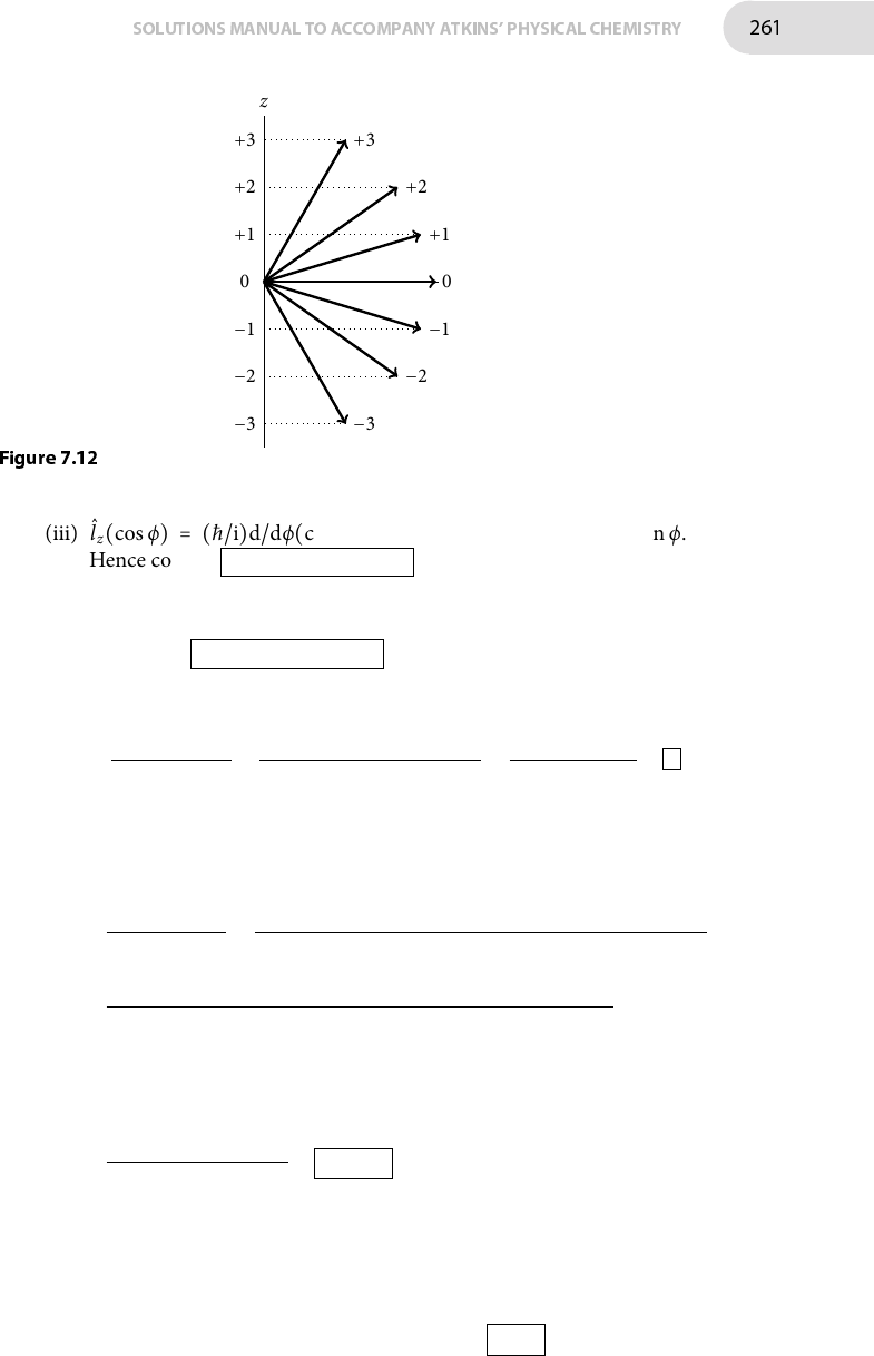 SOLUTIONSMANUAL TO ACCOMPANY ATKINS' PHYSICAL CHEMISTRY 261 +1 0 +2 −1 −2 +3 −3 z +1 −1 +2 −2 +3 −3 0 Figure 7.12 (iii) l̂z(cos ϕ) = (ħ/i)d/dϕ(cos ϕ) = (ħ/i) × (− sin ϕ) = −(ħ/i) sin ϕ. Hence cos ϕ is not an eigenfunction of the operator (ħ/i)d/dϕ. (iv) l̂z(cos χeiϕ+sin χe−iϕ) = (ħ/i)(d/dϕ)(cos χeiϕ+sin χe−iϕ) = (ħ/i)× (i cos χeiϕ − i sin χe−iϕ) = ħ(cos χeiϕ − sin χe−iϕ). Hence cos χeiϕ − sin χe−iϕ is not an eigenfunction of the operator (ħ/i)d/dϕ. (b) For ψ = cos ϕ, ⟨lz⟩ = ∫ 2π 0 ψ∗ l̂zψ dϕ ∫ 2π 0 ψ∗ψ dϕ = −(ħ/i) ∫ 2π 0 cos ϕ sin ϕ dϕ ∫ 2π 0 cos2 ϕ dϕ = −(ħ/2i) sin 4π ∫ 2π 0 cos2 ϕ dϕ = 0 where Integral T.7 is used to evaluate the numerator. For ψ = cos χeiϕ + sin χe−iϕ , ⟨lz⟩ = ∫ 2π 0 ψ∗ l̂zψ dϕ ∫ 2π 0 ψ∗ψ dϕ = ∫ 2π 0 (cos χe−iϕ + sin χeiϕ)ħ(cos χeiϕ − sin χe−iϕ)dϕ ∫ 2π 0 (cos χe−iϕ + sin χeiϕ)(cos χeiϕ + sin χe−iϕ)dϕ = ħ ∫ 2π 0 cos2 χ − sin2 χ − cos χ sin χe−2iϕ + cos χ sin χe2iϕ dϕ ∫ 2π 0 cos2 χ + sin2 χ + cos χ sin χe−2iϕ + cos χ sin χe2iϕ dϕ Note that as einϕ is periodic over 2π for integer n, ∫ 2π 0 einϕdϕ = 0. Hence ⟨lz⟩ = ħ2π(cos2 χ − sin2 χ) 2π(cos2 χ + sin2 χ) = ħ cos 2χ (c) (i) For ψ = eiϕ T̂ψ = −(ħ2/2I)d2(eiϕ)/dϕ2 = −(ħ2/2I)(i)2eiϕ = (ħ2/2I)eiϕ Hence ψ is an eigenfunction with eigenvalue ħ2/2I .