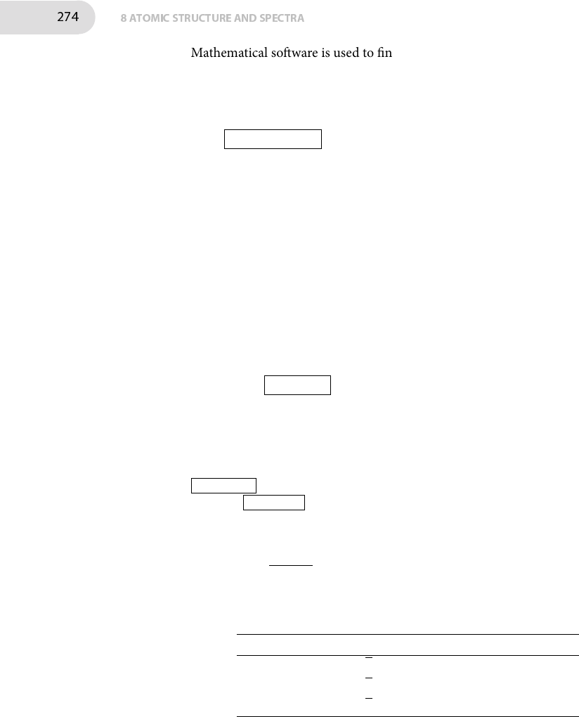 274 8 ATOMIC STRUCTURE AND SPECTRA Mathematical so�ware is used to �nd the values of ρ for which dP(ρ)/dρ = 0, giving the results ρ = 0, 0.493, 1.27, 2.79, 4.73, 8.72. �e simplest way to identify which of these is a maximum is to plot P(ρ) against ρ, fromwhich it is evident that ρ = 0.493, 2.79, 8.72 are all maxima, with the principal maximum being at ρ = 8.72.�emaximum in the radial distribution function is therefore at r = 8.72 × (3a0/2Z) . E8A.9(b) �e radius at which the electron is most likely to be found is that at which the radial distribution function is a maximum.�e radial distribution function is de�ned in [8A.17b–312], P(r) = r2R(r)2. For the 3p orbital R(r) is given in Table 8A.1 on page 306 as R3,0 = N(4 − ρ)ρe−ρ/2 where ρ = 2Zr/na0, which for n = 3 is ρ = 2Zr/3a0. With the substitution r2 = ρ2(3a0/2Z)2,�e radial distribution function is therefore P(ρ) = N2(3a0/2Z)2(4 − ρ)2ρ4e−ρ . To �nd the maximum in this function the derivative is set to zero and the re- sulting equation solved for ρ. Mathematical so�ware gives the following values of ρ: 0, 2, 4, 8. It is evident that P(ρ) is zero at ρ = 0 and ρ = 4, and that P(ρ) tends to zero as ρ → ∞. �erefore ρ = 2 and ρ = 8 must correspond to maxima; a plot of P(ρ) shows that the latter is the principal maximum; this occurs at r = 8(3a0/2Z) . E8A.10(b) �e N shell has n = 4.�e possible values of l (subshells) are 0, corresponding to the s orbital, l = 1 corresponding to the p orbitals, l = 2 corresponding to the d orbitals, and l = 3 corresponding to the f orbitals; there are therefore 4 subshells . As there is one s orbital, 3 p orbitals, 5 d orbitals and 7 p orbitals, there are 16 orbitals in total. E8A.11(b) �e magnitude of the orbital angular momentum of an orbital with quantum number l is √ l(l + 1)ħ.�e total number of nodes for an orbital with quantum number n is n − 1, l of these are angular and so the number of radial nodes is n − l − 1. orbital n l ang. mom. angular nodes radial nodes 4d 4 2 √ 6ħ 2 1 2p 2 1 √ 2ħ 1 0 3p 3 1 √ 2ħ 1 1 E8A.12(b) All the 3d orbitals have the same value of n and l , and hence have the same radial function, which is given in Table 8A.1 on page 306 as R3,2 = Nρ2e−ρ/2 where ρ = 2Zr/na0, which for n = 3 is ρ = 2Zr/3a0. Radial nodes occur when the wavefunction passes through zero.�e function goes to zero at ρ = 0 and as ρ →∞, but it does not pass through zero at these points so they are not nodes. �e number of radial nodes is therefore 0.
