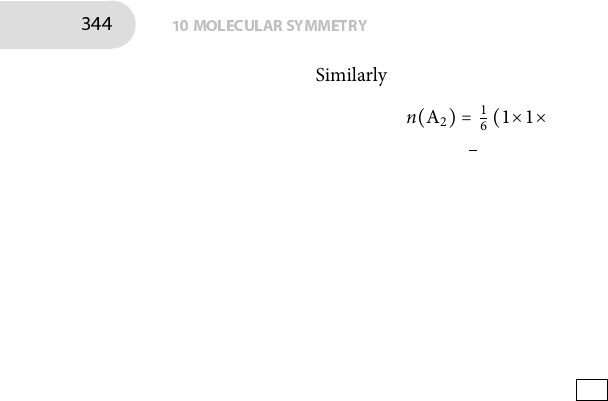 344 10MOLECULAR SYMMETRY Similarly n(A2) = 1 6 (1×1×3 + 2×1×0 + 3×(−1)×1) = 0 n(E) = 1 6 (1×2×3 + 2×(−1)×0 + 3×1×1) = 1 �e three H1s orbitals sB, sC, and sD therefore span A1 +E; adding this to the result from above that sA spans A1 gives 2A1 + E. As explained in Section 10C.2(a) on page 409, only orbitals of the same symmetry species may have a nonzero overlap. �e C3v character table also shows that the dz2 orbital spans A1 in C3v, dx y and dx2−y2 jointly span E, and dxz and dyz also jointly span E. It follows that dz2 can form molecular orbitals with the A1 combinations of hydrogen orbitals while the other d orbitals can all form molecular orbitals with the E combi- nations of hydrogen orbitals. So yes , more d orbitals can be involved in formingmolecular orbitals than in the case of tetrahedralmethanewhere, as shown in the previous exercise, only dx y , dyz and dxz are able to form molecular orbitals. (b) �e irreducible representations spanned by the H1s orbitals in the C2v distorted molecule, shown in the right-hand side of Fig. 10.18, are found in the same way as above. It is convenient to consider sA and sB separately from sC and sD.�is is because sA and sB are mixed with each other but not with sC or sD by the operations of the group. Similarly sC and sD are mixed with each other but not with sA or sB. For sA and sB the matrix representatives are D(E) = ( 1 0 0 1 ) D(C2) = ( 0 1 1 0 ) D(σv) = ( 1 0 0 1 ) D(σ ′v) = ( 0 1 1 0 ) for which the characters are χ(E) = 2 χ(C2) = 0 χ(σv) = 2 χ(σ ′v) = 0 As before, this result is obtained with much less e�ort by simply counting the number of orbitals which are not moved by each operation. Using the decomposition formula, or simply by inspection of the C2v character table, this representation decomposes to A1 +B1. Analysing sC and sD in the same way gives the representatives as D(E) = ( 1 0 0 1 ) D(C2) = ( 0 1 1 0 ) D(σv) = ( 0 1 1 0 ) D(σ ′v) = ( 1 0 0 1 ) �e characters are χ(E) = 2 χ(C2) = 0 χ(σv) = 0 χ(σ ′v) = 2