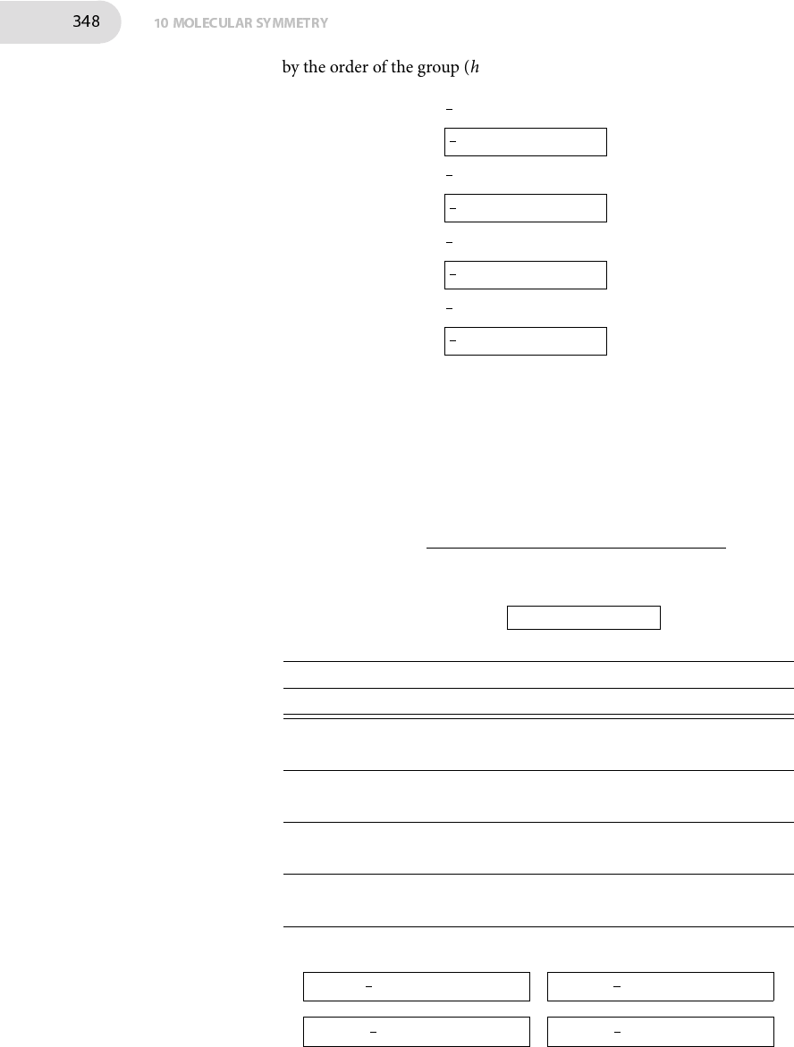 348 10MOLECULAR SYMMETRY by the order of the group (h = 8). Row 3: ψ(B2g) = 1 8 (pA − pC − pB + pD − pC + pA − pB + pD) = 1 4 (pA − pB − pC + pD) Row 5: ψ(B3g) = 1 8 (pA − pC + pB − pD − pC + pA + pB − pD) = 1 4 (pA + pB − pC − pD) Row 7: ψ(Au) = 1 8 (pA + pC − pB − pD + pC + pA − pB − pD) = 1 4 (pA − pB + pC − pD) Row 9: ψ(B1u) = 1 8 (pA + pC + pB + pD + pC + pA + pB + pD) = 1 4 (pA − pB + pC − pD) (c) �e 2px orbitals, shown in the right-hand half of Fig. 10.19, are analysed in the same way. �e characters are found by noting that under the E operation the four px orbitals are notmoved so χ(E) = 4. Similarly under the Cz2 operation the orbitals are all moved so χ(Cz2) = 0. Using this approach the characters are written down as E Cz2 C y2 Cx2 i σ x y σ yz σ zx 4 0 0 0 0 4 0 0 Using the decomposition formula, or simply by inspection of the charac- ter table, this is decomposed to Ag + B1g + B2u + B3u . Use of the projec- tion operator then gives Row E Cz2 C y2 Cx2 i σ x y σ yz σ zx 1 e�ect on pA pA −pC −pB pD −pC pA −pB pD 2 characters for Ag 1 1 1 1 1 1 1 1 3 row 1 × row 2 pA −pC −pB pD −pC pA −pB pD 4 characters for B1g 1 1 −1 −1 1 1 −1 −1 5 row 1 × row 4 pA −pC pB −pD −pC pA pB −pD 6 characters for B2u 1 −1 1 −1 −1 1 1 −1 7 row 1 × row 6 pA pC −pB −pD pC pA −pB −pD 8 characters for B1u 1 −1 −1 1 −1 1 −1 1 9 row 1 × row 8 pA pC pB pD pC pA pB pD Hence the SALCs are ψ(Ag) = 1 4 (pA − pB − pC + pD) ψ(B1g) = 1 4 (pA + pB − pC − pD) ψ(B2u) = 1 4 (pA − pB + pC − pD) ψ(B3u) = 1 4 (pA + pB + pC + pD)