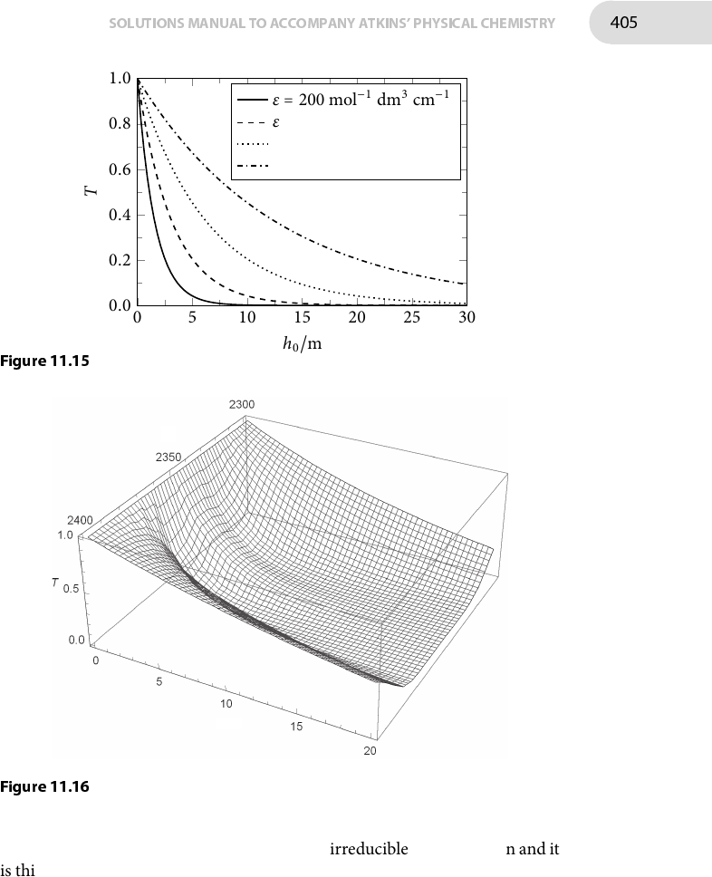 SOLUTIONSMANUAL TO ACCOMPANY ATKINS' PHYSICAL CHEMISTRY 405 0 5 10 15 20 25 30 0.0 0.2 0.4 0.6 0.8 1.0 h0/m T ε = 200 mol−1 dm3 cm−1 ε = 100 ε = 50 ε = 25 Figure 11.15 v /cm−1~ h 0 /m Figure 11.16 product always includes the totally symmetric irreducible representation and it is this symmetry species which needs to be combined with the anti-symmetric spin function for two spin-paired electrons. (a) Ethene belongs to the point group D2h: assume that the molecule lies in the xy-plane, with the C–C bond along x. �e π bonding molecular orbital transforms in the same way as the cartesian function z, that is as B1u. �e π∗ anti-bonding molecular orbital transforms in the same way as the cartesian function xz, that is as B2g. �e excited state (π)1 (π∗)1 therefore has symmetry B1u × B2g = B3u (the direct product is found by multiplying together the characters of the two irreducible representations, as described in Section 10C.1(a) on page 407).