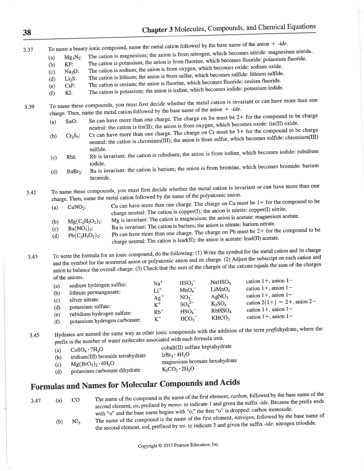 38 Chapter 3 Molecules, Compounds, and Chemical Equations 3.37 To name a binary ionic compound, name the metal cation followed by the base name of the anion + -ide. (a) Mg₃N₂: The cation is magnesium; the anion is from nitrogen, which becomes nitride: magnesium nitride. (b) KF: The cation is potassium; the anion is from fluorine, which becomes fluoride: potassium fluoride. (c) Na₂O: The cation is sodium; the anion is from oxygen, which becomes oxide: sodium oxide. (d) Li₂S: The cation is lithium; the anion is from sulfur, which becomes sulfide: lithium sulfide. (e) CsF: The cation is cesium; the anion is fluorine, which becomes fluoride: cesium fluoride. (f) KI: The cation is potassium; the anion is iodine, which becomes iodide: potassium iodide. 3.39 To name these compounds, you must first decide whether the metal cation is invariant or can have more than one charge. Then, name the metal cation followed by the base name of the anion + -ide. (a) SnO: Sn can have more than one charge. The charge on Sn must be 2+ for the compound to be charge neutral: the cation is tin(II); the anion is from oxygen, which becomes oxide: tin(II) oxide. (b) Cr₂S₃: Cr can have more than one charge. The charge on Cr must be 3+ for the compound to be charge neutral: the cation is chromium(III); the anion is from sulfur, which becomes sulfide: chromium(III) sulfide. (c) RbI: Rb is invariant: the cation is rubidium; the anion is from iodine, which becomes iodide: rubidium iodide. (d) BaBr₂: Ba is invariant: the cation is barium; the anion is from bromine, which becomes bromide: barium bromide. 3.41 To name these compounds, you must first decide whether the metal cation is invariant or can have more than one charge. Then, name the metal cation followed by the name of the polyatomic anion. (a) CuNO₂: Cu can have more than one charge. The charge on Cu must be 1+ for the compound to be charge neutral: The cation is copper(I); the anion is nitrite: copper(I) nitrite. (b) Mg(C₂H₃O₂)₂: Mg is invariant: The cation is magnesium; the anion is acetate: magnesium acetate. (c) Ba(NO₃)₂: Ba is invariant: The cation is barium; the anion is nitrate: barium nitrate. (d) Pb(C₂H₃O₂)₂: Pb can have more than one charge. The charge on Pb must be 2+ for the compound to be charge neutral: The cation is lead(II); the anion is acetate: lead(II) acetate. 3.43 To write the formula for an ionic compound, do the following: (1) Write the symbol for the metal cation and its charge and the symbol for the nonmetal anion or polyatomic anion and its charge. (2) Adjust the subscript on each cation and anion to balance the overall charge. (3) Check that the sum of the charges of the cations equals the sum of the charges of the anions. (a) sodium hydrogen sulfite: cation 1+, anion 1- (b) lithium permanganate: MnO₄⁻ LiMnO₄ cation 1+, anion 1- (c) silver nitrate: cation 1+, anion 1- (d) potassium sulfate: K₂SO₄ cation 2(1+) = 2+, anion 2- (e) rubidium hydrogen sulfate: cation 1+, anion 1- (f) potassium hydrogen carbonate: K⁺ KHCO₃ cation 1+, anion 1- 3.45 Hydrates are named the same way as other ionic compounds with the addition of the term prefixhydrate, where the prefix is the number of water molecules associated with each formula unit. (a) CoSO₄ cobalt(II) sulfate heptahydrate (b) iridium(III) bromide tetrahydrate IrBr₃ (c) Mg(BrO₃)₂ magnesium bromate hexahydrate (d) potassium carbonate dihydrate K₂CO₃ Formulas and Names for Molecular Compounds and Acids 3.47 (a) CO The name of the compound is the name of the first element, carbon, followed by the base name of the second element, ox, prefixed by mono- to indicate 1 and given the suffix -ide. Because the prefix ends with "o" and the base name begins with "o," the first is dropped: carbon monoxide. (b) NI₃ The name of the compound is the name of the first element, nitrogen, followed by the base name of the second element, iod, prefixed by tri- to indicate 3 and given the suffix -ide: nitrogen triiodide. Copyright © 2017 Pearson Education, Inc.