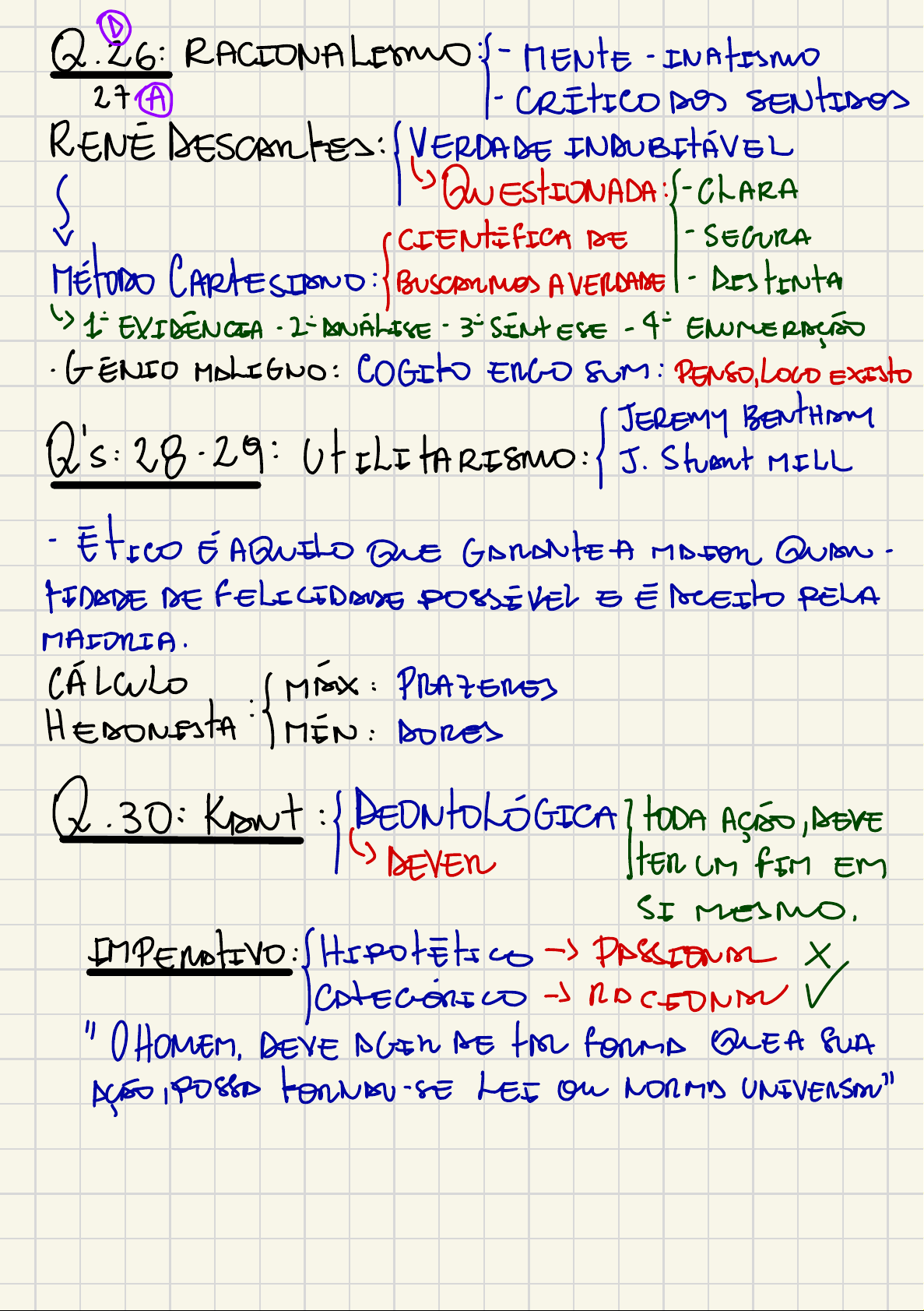 160 CIÊNCIAS HUMANAS E SUAS TECNOLOGIAS QUESTÃO 26 (AQUILES AMARAL 2025) […] enquanto me limitei a considerar os costumes dos outros homens, quase nada encontrei que me desse segurança, e notava quase tanta diversidade quanto antes observava entre as opiniões dos filósofos. De forma que o maior proveito que disso tirava era que […] aprendia a não crer com muita firmeza em nada do que só me fora persuadido pelo exemplo e pelo costume; e assim desvencilhava-me pouco a pouco de muitos erros, que podem ofuscar nossa luz natural e nos tornar menos capazes de ouvir a razão. DESCARTES, R. Discurso do método. 2. ed. São Paulo: Martins Fontes, 1996. p. 14. (adaptado) Qual característica do método cartesiano é evidenciada no texto? Abandono de objetos de estudo considerados simples. Subordinação da consciência aos costumes extrínsecos. Segmentação dos dados para estudos científicos sensíveis. Questionamento de conceitos preestabelecidos socialmente. Variedade de possibilidades para se chegar à razão filosófica. QUESTÃO 27 Mas o que sou eu, portanto? Uma coisa que pensa. Que é uma coisa que pensa? É uma coisa que duvida, que concebe, que afirma, que nega, que quer, que não quer, que imagina também e que sente. Certamente não é pouco S todas essas coisas pertencem à minha natureza. Mas por que não lhe pertenceriam? Não sou eu próprio esse mesmo que duvida de quase tudo, que, no entanto, entende e concebe certas coisas, que assegura e afirma que somente tais coisas são verdadeiras, que nega todas as demais, que quer e deseja conhecê-las mais, que não quer ser enganado, que imagina muitas coisas, mesmo mau grado seu, e que sente também muitas como que por intermédio dos órgãos do corpo? Haverá algo em tudo isso que não seja tão verdadeiro quanto é certo que sou e que existo, mesmo quando aquele que me deu a existência se servisse de todas as suas forças para enganar-me? DESCARTES, R. Meditações. In: Descartes (coleção Os Pensadores) São Paulo: Abril Cultural, 1979. p. 95. A filosofia de Descartes tem como ponto de partida a ideia do cogito, que estabelece como fundamento do conhecimento o(a) sujeito pensante. matéria analisada. existência de Deus. impressão dos sentidos. corpo e os órgãos sensoriais. QUESTÃO 28 (AQUILES AMARAL 2025) "John Stuart Mill afirma que 'As ações são corretas na proporção em que tendem a promover a felicidade; erradas na proporção em que tendem a produzir o oposto da felicidade'." (Utilitarianism, 1861) De acordo com Mill, o utilitarismo entende a felicidade como: A busca exclusiva de prazeres físicos imediatos. Um objetivo inatingível devido à natureza egoísta do ser humano. A ausência de dor e a promoção do prazer como critério de moralidade. A promoção de benefícios apenas para a própria pessoa, sem pensar no coletivo. A imposição de valores morais universais, independentemente das consequências. QUESTÃO 29 (AQUILES AMARAL 2025) "John Stuart Mill comenta que 'Kant acreditava que a base da moralidade repousava em princípios a priori e universais, enquanto o utilitarismo defende que a moralidade deve ser julgada pelos efeitos práticos que ações têm sobre a felicidade'." (Utilitarianism, 1861) Conforme Mill, a principal diferença entre a ética kantiana e o utilitarismo é que: Kant propõe que a felicidade é o objetivo central da moralidade, diferentemente do utilitarismo. Kant defende que o bem maior é a felicidade coletiva, enquanto o utilitarismo é individualista. O utilitarismo se baseia em princípios universais, enquanto Kant rejeita os valores coletivos. Kant valoriza o dever moral a priori, enquanto o utilitarismo valoriza as consequências das ações. O utilitarismo não considera os resultados práticos das ações, ao contrário de Kant que valoriza as consequências de uma ação. QUESTÃO 30 (AQUILES AMARAL 2025) Deveres éticos envolvem um constrangimento para o qual somente a legislação interna é possível. Uma vez que a faculdade moral de constranger a si mesmo pode ser chamada de virtude, a ação que emerge de tal disposição (respeito pela lei) pode ser chamada de ação (ética) virtuosa, ainda que a lei estabeleça um dever de direito, pois é a doutrina da virtude que nos ordena a manter sagrado o direito dos seres humanos. KANT, Immanuel. A Metafísica dos Costumes. São Paulo: Ed. Folha de São Paulo, 2010. p. 163. (adaptado). Segundo o posicionamento filosófico apresentado, a ação virtuosa está amparada no alinhamento entre obrigação e razão. instinto e condição. disposição e desejo. coerção e aceitação. norma e penalização. 161 CIÊNCIAS HUMANAS E SUAS TECNOLOGIAS QUESTÃO 31 (AQUILES AMARAL 2025) "A vida oscila, como um pêndulo, entre a dor e o tédio, que são, de fato, seus dois elementos constitutivos." (Schopenhauer, O Mundo como Vontade e Representação, Livro IV) Conforme o trecho de Schopenhauer, é possível entender que: O ser humano está sempre satisfeito com a vida, sendo o tédio algo ocasional. A vida alterna entre momentos de realização plena e momentos de tédio. O sofrimento e o tédio são as duas condições inevitáveis da existência humana. O tédio é uma condição que surge quando as necessidades materiais não são atendidas. O tédio ocorre apenas quando não há sofrimento. QUESTÃO 32 (AQUILES AMARAL 2025) "A cultura ocidental é a cultura da decadência, fundamentada em valores que negam a vida, em uma moral que prefere o fraco ao forte, o ressentido ao criador." (Nietzsche, Crepúsculo dos Ídolos) De acordo com Nietzsche, a crítica à cultura ocidental está relacionada a: A humilhação dos valores heroicos da antiguidade. A busca incessante pelo poder e pela dominação. A valorização excessiva da ciência em detrimento da religião. A moral que nega a vida, exaltando o fraco e o ressentido. A crença em um destino predeterminado que impede a autonomia humana. QUESTÃO 33 (AQUILES AMARAL 2025) 