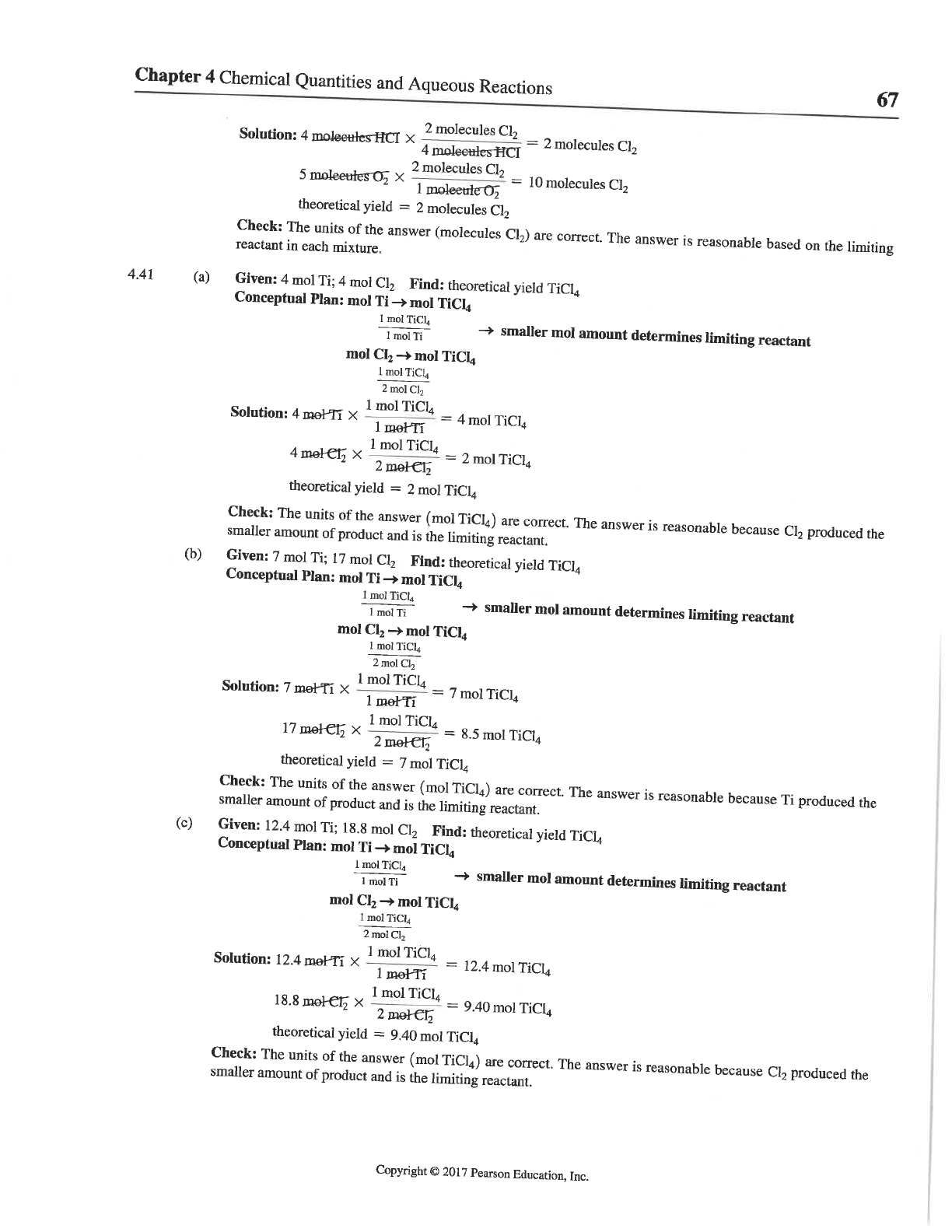 Chapter 4 Chemical Quantities and Aqueous Reactions 67 2 molecules Cl₂ Solution: 4 molecules HCI X = 2 molecules Cl₂ 4 molecules HCI 2 molecules Cl₂ 5 molecules O₂ X = 10 molecules Cl₂ 1 molecule O₂ theoretical yield = 2 molecules Cl₂ Check: The units of the answer (molecules Cl₂) are correct. The answer is reasonable based on the limiting reactant in each mixture. 4.41 (a) Given: 4 mol Ti; 4 mol Cl₂ Find: theoretical yield TiCl₄ Conceptual Plan: mol Ti mol 1 mol smaller mol amount determines limiting reactant 1 mol Ti mol mol TiCl₄ 1 mol 2 mol Cl₂ 1 mol Solution: 4 X = 4 mol 1 mol 4 mol X 1 mol = 2 mol TiCl₄ 2 mol theoretical yield = 2 mol Check: The units of the answer (mol are correct. The answer is reasonable because Cl₂ produced the smaller amount of product and is the limiting reactant. (b) Given: 7 mol Ti; 17 mol Cl₂ Find: theoretical yield TiCl₄ Conceptual Plan: mol Ti mol TiCl₄ 1 mol TiCl₄ smaller mol amount determines limiting reactant 1 mol Ti mol Cl₂ mol TiCl₄ 1 mol 2 mol Cl₂ 1 mol Solution: 7 molTi X = 7 mol 1 17 X 1 mol = 8.5 mol TiCl₄ 2 theoretical yield = 7 mol TiCl₄ Check: The units of the answer (mol are correct. The answer is reasonable because Ti produced the smaller amount of product and is the limiting reactant. (c) Given: 12.4 mol Ti; 18.8 mol Cl₂ Find: theoretical yield TiCl₄ Conceptual Plan: mol Ti mol TiCl₄ 1 mol smaller mol amount determines limiting reactant 1 mol Ti mol Cl₂ mol TiCl₄ 1 mol 2 mol Cl₂ 1 mol TiCl₄ Solution: 12.4 Ti X = 12.4 mol 1 mol 18.8 X 1 2 mol = 9.40 mol theoretical yield = 9.40 mol Check: The units of the answer (mol are correct. The answer is reasonable because Cl₂ produced the smaller amount of product and is the limiting reactant. Copyright © 2017 Pearson Education, Inc.