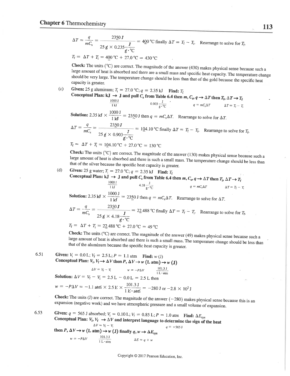 Chapter 6 Thermochemistry 113 q = = J = 400 °C finally = Tf - Tᵢ. Rearrange to solve for Tf. g X 0.235 °C = + Tᵢ = 400 + 27.0 = 430 Check: The units (°C) are correct. The magnitude of the answer (430) makes physical sense because such a large amount of heat is absorbed and there are a small mass and specific heat capacity. The temperature change should be very large. The temperature change should be less than that of the gold because the specific heat capacity is greater. (c) Given: 25 g aluminum; = 27.0 °C; q = 2.35 kJ Find: Conceptual Plan: kJ J and pull Cₛ from Table 6.4 then m, Cₛ, q AT then Tᵢ, 1000J 0.903 J 1kJ °C q = Solution: 2.35 X = 2350 then q = Rearrange to solve for T. q = = mCₛ = finally AT = Tf Rearrange to solve for Tf. 25 g X °C = + Tᵢ = 104.10 °C + 27.0 °C = 130 Check: The units (°C) are correct. The magnitude of the answer (130) makes physical sense because such a large amount of heat is absorbed and there is such a small mass. The temperature change should be less than that of the silver because the specific heat capacity is greater. (d) Given: 25 g water; Tᵢ = 27.0 °C; q = 2.35 kJ Find: Conceptual Plan: kJ J and pull Cₛ from Table 6.4 then m, Cₛ, then AT J q = AT = Tf Tᵢ 1000J Solution: 2.35 X = 2350 J then q = Rearrange to solve for q = = = 22.488 °C finally = Rearrange to solve for Tf. 25 °C Tf = + = 22.488 + 27.0 °C = 49 °C Check: The units (°C) are correct. The magnitude of the answer (49) makes physical sense because such a large amount of heat is absorbed and there is such a small mass. The temperature change should be less than that of the aluminum because the specific heat capacity is greater. 6.51 Given: = 0.0 L; Vf = 2.5 L; P = 1.1 atm Find: (J) Conceptual Plan: Vᵢ, Vf V then P, W (J) -PAV Solution: V = Vf Vᵢ = 0.0L = 2.5 L then = PAV = 1.1 atm X X 101.3J = 280 J or -2.8 X 10² J Check: The units (J) are correct. The magnitude of the answer (-280) makes physical sense because this is an expansion (negative work) and we have atmospheric pressure and a small volume of expansion. 6.53 Given: q = 565 J absorbed; = Vf = 0.85 L; P = 1.0 atm Find: Conceptual Plan: Vᵢ, V and interpret language to determine the sign of the heat q = then P, W (L atm) (J) finally q, = -PAV = q + atm Copyright © 2017 Pearson Education, Inc.