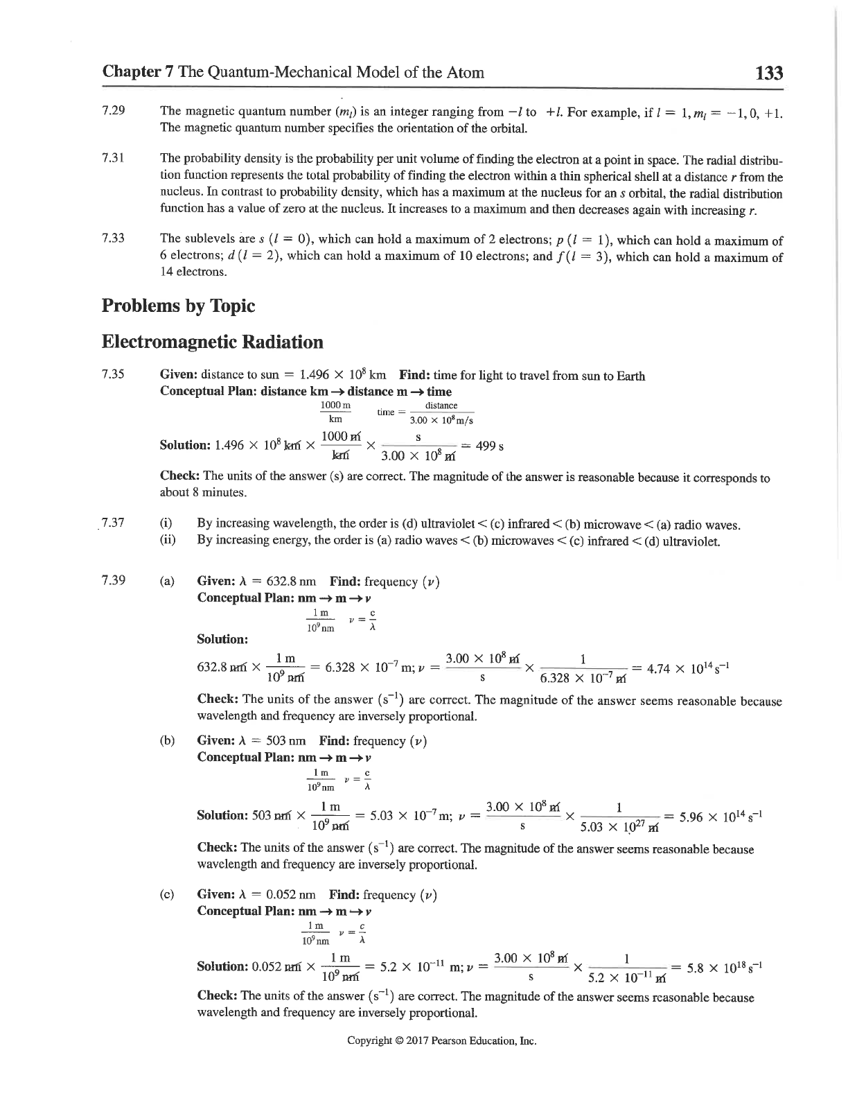 Chapter 7 The Quantum-Mechanical Model of the Atom 133 7.29 The magnetic quantum number is an integer ranging from to +1. For example, if = 1, = - 1,0, +1. The magnetic quantum number specifies the orientation of the orbital. 7.31 The probability density is the probability per unit volume of finding the electron at a point in space. The radial distribu- tion function represents the total probability of finding the electron within a thin spherical shell at a distance r from the nucleus. In contrast to probability density, which has a maximum at the nucleus for an s orbital, the radial distribution function has a value of zero at the nucleus. It increases to a maximum and then decreases again with increasing r. 7.33 The sublevels are = 0), which can hold a maximum of 2 electrons; p = 1), which can hold a maximum of 6 electrons; d = 2), which can hold a maximum of 10 electrons; and = 3), which can hold a maximum of 14 electrons. Problems by Topic Electromagnetic Radiation 7.35 Given: distance to sun = 1.496 X 10⁸ km Find: time for light to travel from sun to Earth Conceptual Plan: distance km distance m time 1000 m distance time = km 3.00 m/s Solution: 1.496 X 10⁸ km X 1000 X 3.00 X S 10⁸ = 499 Check: The units of the answer (s) are correct. The magnitude of the answer is reasonable because it corresponds to about 8 minutes. 7.37 (i) By increasing wavelength, the order is (d) ultraviolet