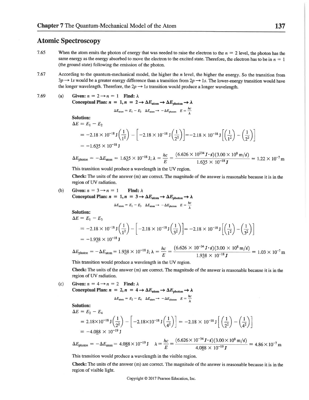 Chapter 7 The Quantum-Mechanical Model of the Atom 137 Atomic Spectroscopy 7.65 When the atom emits the photon of energy that was needed to raise the electron to the n = 2 level, the photon has the same energy as the energy absorbed to move the electron to the excited state. Therefore, the electron has to be in n = 1 (the ground state) following the emission of the photon. 7.67 According to the quantum-mechanical model, the higher the n level, the higher the energy. So the transition from 3p 1s would be a greater energy difference than a transition from 2p 1s. The lower-energy transition would have the longer wavelength. Therefore, the 2p 1s transition would produce a longer wavelength. 7.69 (a) Given: n = 2 n = 1 Find: Conceptual Plan: n = = Solution: = This transition would produce a wavelength in the UV region. Check: The units of the answer (m) are correct. The magnitude of the answer is reasonable because it is in the region of UV radiation. (b) Given: n = 3 = Find: Conceptual Plan: n Solution: = = m This transition would produce a wavelength in the UV region. Check: The units of the answer (m) are correct. The magnitude of the answer is reasonable because it is in the region of UV radiation. (c) Given: n = 4 = 2 Find: Conceptual Plan: = 4 Solution: This transition would produce a wavelength in the visible region. Check: The units of the answer (m) are correct. The magnitude of the answer is reasonable because it is in the region of visible light. Copyright © 2017 Pearson Education, Inc.