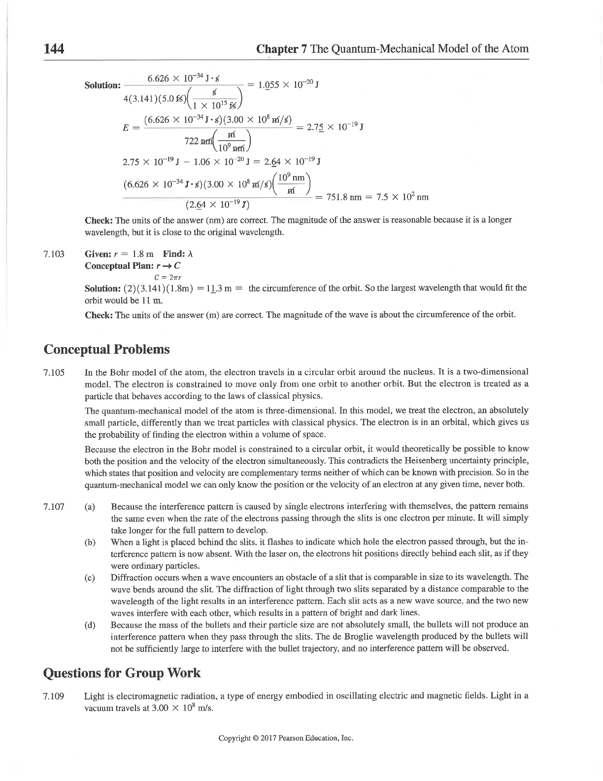 144 Chapter 7 The Quantum-Mechanical Model of the Atom 6.626 X 10⁻³⁴ Solution: = 1.055 X 10⁻²⁰ J E = (6.626 X X 10⁸ = 2.75 X J 722 2.75 X 10⁻¹⁹ J - 1.06 X = 2.64 X 10⁻¹⁹ (6.626 X X = 751.8 nm = 7.5 X 10² nm (2.64 X Check: The units of the answer (nm) are correct. The magnitude of the answer is reasonable because it is a longer wavelength, but it is close to the original wavelength. 7.103 Given: r = 1.8 m Find: \ Conceptual Plan: r C C = 2πr Solution: (2)(3.141)(1.8m) = 11.3 m = the circumference of the orbit. So the largest wavelength that would fit the orbit would be 11 m. Check: The units of the answer (m) are correct. The magnitude of the wave is about the circumference of the orbit. Conceptual Problems 7.105 In the Bohr model of the atom, the electron travels in a circular orbit around the nucleus. It is a two-dimensional model. The electron is constrained to move only from one orbit to another orbit. But the electron is treated as a particle that behaves according to the laws of classical physics. The quantum-mechanical model of the atom is three-dimensional. In this model, we treat the electron, an absolutely small particle, differently than we treat particles with classical physics. The electron is in an orbital, which gives us the probability of finding the electron within a volume of space. Because the electron in the Bohr model is constrained to a circular orbit, it would theoretically be possible to know both the position and the velocity of the electron simultaneously. This contradicts the Heisenberg uncertainty principle, which states that position and velocity are complementary terms neither of which can be known with precision. So in the quantum-mechanical model we can only know the position or the velocity of an electron at any given time, never both. 7.107 (a) Because the interference pattern is caused by single electrons interfering with themselves, the pattern remains the same even when the rate of the electrons passing through the slits is one electron per minute. It will simply take longer for the full pattern to develop. (b) When a light is placed behind the slits, it flashes to indicate which hole the electron passed through, but the in- terference pattern is now absent. With the laser on, the electrons hit positions directly behind each slit, as if they were ordinary particles. (c) Diffraction occurs when a wave encounters an obstacle of a slit that is comparable in size to its wavelength. The wave bends around the slit. The diffraction of light through two slits separated by a distance comparable to the wavelength of the light results in an interference pattern. Each slit acts as a new wave source, and the two new waves interfere with each other, which results in a pattern of bright and dark lines. (d) Because the mass of the bullets and their particle size are not absolutely small, the bullets will not produce an interference pattern when they pass through the slits. The de Broglie wavelength produced by the bullets will not be sufficiently large to interfere with the bullet trajectory, and no interference pattern will be observed. Questions for Group Work 7.109 Light is electromagnetic radiation, a type of energy embodied in oscillating electric and magnetic fields. Light in a vacuum travels at 3.00 X 10⁸ m/s. Copyright © 2017 Pearson Education, Inc.