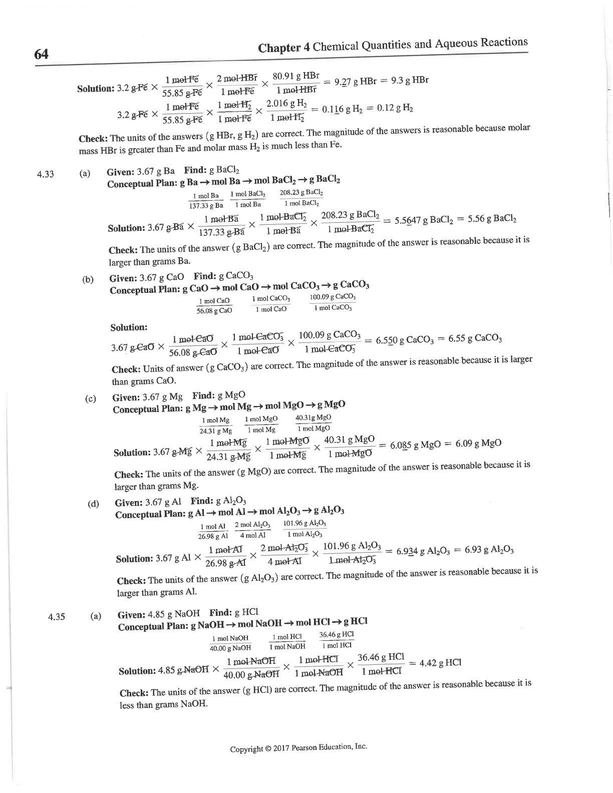 64 Chapter 4 Chemical Quantities and Aqueous Reactions Solution: 3.2 X 55.85 1 X 2 1 mol Fe 80.91 1 g HBr = 9.27 g HBr = 9.3 g HBr 3.2 X 55.85 1 1 1 X 2.016 1 H₂ = 0.116 g H₂ = 0.12 g Check: The units of the answers (g HBr, g H₂) are correct. The magnitude of the answers is reasonable because molar mass HBr is greater than Fe and molar mass H₂ is much less than Fe. 4.33 (a) Given: 3.67 g Ba Find: g BaCl₂ Conceptual Plan: g Ba mol Ba mol BaCl₂ g BaCl₂ 1 mol Ba 1 mol BaCl₂ 208.23 g BaCl₂ 137.33 g Ba 1 mol Ba 1 mol BaCl₂ Solution: 3.67 X 137.33 1 mol Ba Ba X 1 1 X 208.23 1 g BaCl₂ = 5.5647 g BaCl₂ = 5.56 g BaCl₂ Check: The units of the answer (g BaCl₂) are correct. The magnitude of the answer is reasonable because it is larger than grams Ba. (b) Given: 3.67 g CaO Find: g CaCO₃ Conceptual Plan: g CaO mol CaO mol CaCO₃ g CaCO₃ 1 mol CaO 1 mol CaCO₃ 100.09 g CaCO₃ 56.08 g CaO 1 mol CaO 1 mol CaCO₃ Solution: 3.67 56.08 1 g X 1 1 X 100.09 1 g CaCO₃ = 6.550 g CaCO₃ = 6.55 g CaCO₃ Check: Units of answer (g CaCO₃) are correct. The magnitude of the answer is reasonable because it is larger than grams CaO. (c) Given: 3.67 g Mg Find: g MgO Conceptual Plan: g Mg mol Mg mol MgO g MgO 1 mol Mg 1 mol MgO 40.31g MgO 24.31 g Mg 1 mol Mg 1 mol MgO Solution: 3.67 X 24.31 1 1 1 X 40.31 1 g MgO = 6.085 g MgO = 6.09 g MgO Check: The units of the answer (g MgO) are correct. The magnitude of the answer is reasonable because it is larger than grams Mg. (d) Given: 3.67 g Al Find: g Conceptual Plan: g Al mol Al mol g 1 mol Al 2 mol 101.96 g 26.98 g Al 4 mol Al 1 mol Solution: 3.67 g Al X 26.98 1 X 2 4 X 101.96 g = 6.934 g = 6.93 g Check: The units of the answer (g are correct. The magnitude of the answer is reasonable because it is larger than grams Al. 4.35 (a) Given: 4.85 g NaOH Find: g Conceptual Plan: g NaOH mol NaOH mol HCI g HCI 1 mol NaOH 1 mol HCI 36.46 g HCI 40.00 g NaOH 1 mol NaOH 1 mol HCI Solution: 4.85 NaOH X 40.00 1 mol NaOH NaOH 1 1 X 36.46 1 mol g HCI = 4.42 g HCI Check: The units of the answer (g HCI) are correct. The magnitude of the answer is reasonable because it is less than grams NaOH. Copyright © 2017 Pearson Education, Inc.