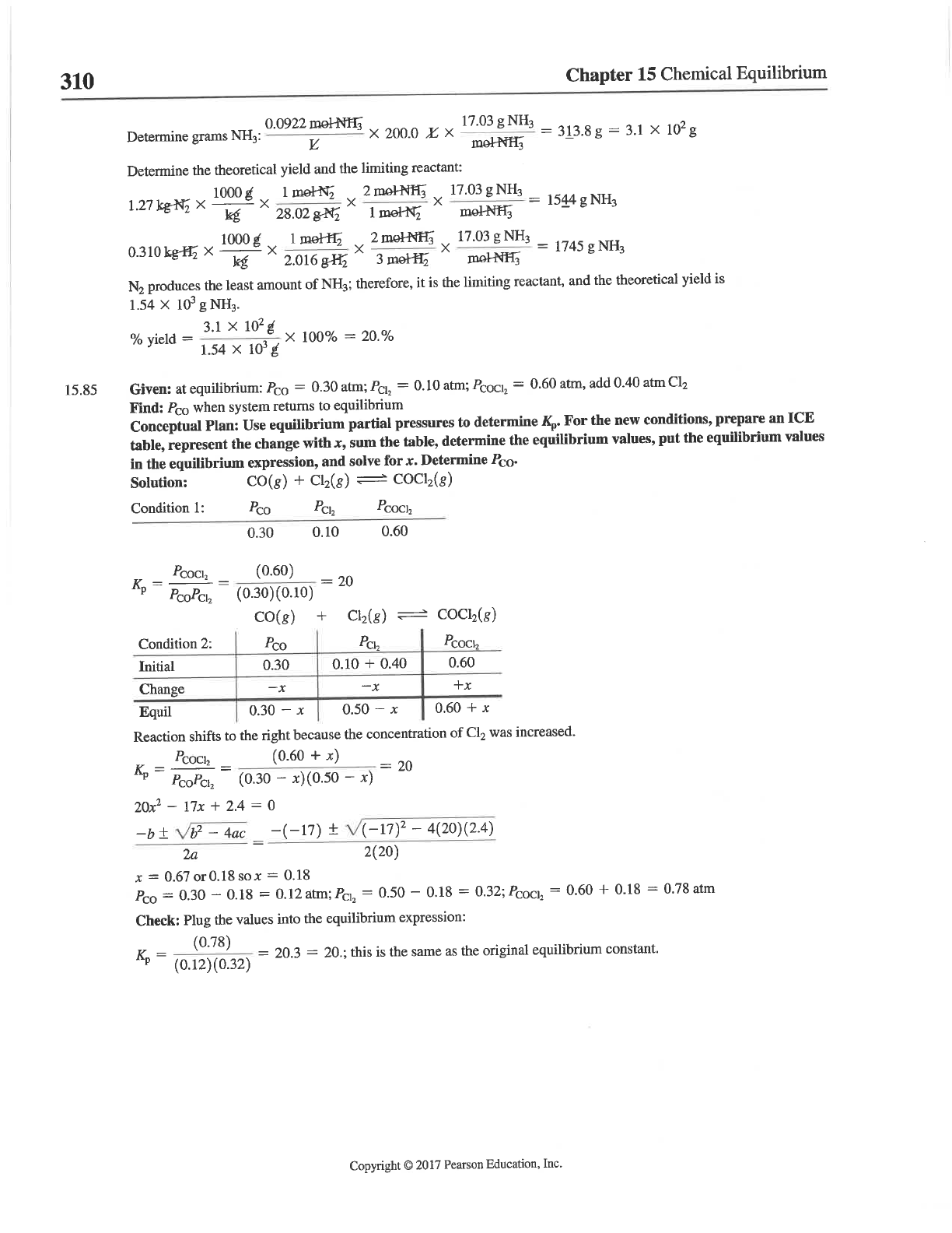 310 Chapter 15 Chemical Equilibrium Determine grams 0.0922 L X 200.0 X X 17.03 = 313.8 g = 3.1 X 10² g Determine the theoretical yield and the limiting reactant: 1.27 X 1000 kg X 28.02 1 X 2 1 X 17.03 NH₃ = 1544 g NH₃ 0.310 X 1000 kg X 2.016 1 X 2 3 X 17.03 g = 1745 g N₂ produces the least amount of therefore, it is the limiting reactant, and the theoretical yield is 1.54 X 10³ g % yield = 1.54 3.1 X X 10² 10³ X 100% = 20.% 15.85 Given: at equilibrium: Pco = 0.30 atm; = 0.10 atm; = 0.60 atm, add 0.40 atm Cl₂ Find: when system returns to equilibrium Conceptual Plan: Use equilibrium partial pressures to determine Kₚ. For the new conditions, prepare an ICE table, represent the change with x, sum the table, determine the equilibrium values, put the equilibrium values in the equilibrium expression, and solve for x. Determine Solution: CO(g) + 1L Condition 1: Pco 0.30 0.10 0.60 Kₚ = = (0.30)(0.10) (0.60) = 20 CO(g) + 1L Condition 2: Pco Initial 0.30 0.10 + 0.40 0.60 Change -x -x +x Equil 0.30 x 0.50 - x Reaction shifts to the right because the concentration of Cl₂ was increased. = = (0.30 x) = 20 (0.60 + x) 20x² 17x + 2.4 = 0 4ac -(-17) ± 4(20)(2.4) = 2a 2(20) x = 0.67 or 0.18 so x = 0.18 = 0.30 - 0.18 = 0.12 atm; = 0.50 0.18 = 0.32; = 0.60 + 0.18 = 0.78 atm Check: Plug the values into the equilibrium expression: = (0.12)(0.32) (0.78) = 20.3 = 20.; this is the same as the original equilibrium constant. Copyright © 2017 Pearson Education, Inc.