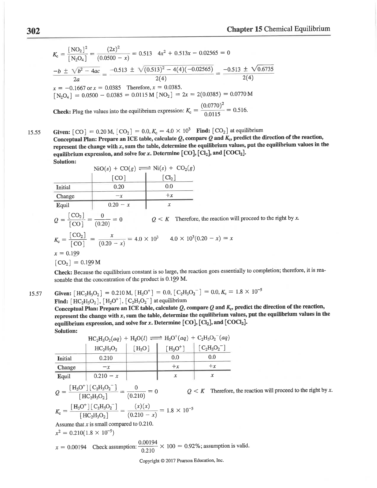 302 Chapter 15 Chemical Equilibrium Kc = [N₂O₄] = (0.0500 = 0.513 + 0.513x 0.02565 = 0 -b ± 4ac -0.513 ± 4(4)(-0.02565) -0.513 ± V0.6735 = = 2a 2(4) 2(4) x = -0.1667 or x = 0.0385 Therefore, x = 0.0385. [N₂O₄] = 0.0500 0.0385 = 0.0115 [NO₂] = 2x = 2(0.0385) = Check: Plug the values into the equilibrium expression: Kc = 0.0115 = 0.516. 15.55 Given: = 0.20 M, [CO₂] = 0.0, Kc = 4.0 X 10³ Find: [CO₂] at equilibrium Conceptual Plan: Prepare an ICE table, calculate Q, compare Q and Kc, predict the direction of the reaction, represent the change with x, sum the table, determine the equilibrium values, put the equilibrium values in the equilibrium expression, and solve for x. Determine and Solution: NiO(s) + CO(g) Ni(s) + [CO] [Cl₂] Initial 0.20 0.0 Change -x +x Equil x Q = [CO₂] [CO] = (0.20) 0 = 0 Therefore, the reaction will proceed to the right by Kc = [CO₂] [CO] = (0.20 x = 4.0 X 10³ 4.0 X 10³(0.20 - x) = x x = 0.199 [CO₂] = 0.199 M Check: Because the equilibrium constant is large, the reaction goes essentially to completion; therefore, it is rea- sonable that the concentration of the product is 0.199 M. 15.57 Given: [HC₂H₃O₂] = [H₃O⁺] = 0.0, = 0.0, = 1.8 X 10⁻⁵ Find: [HC₂H₃O₂], [H₂O⁺], at equilibrium Conceptual Plan: Prepare an ICE table, calculate Q, compare Q and Kc, predict the direction of the reaction, represent the change with x, sum the table, determine the equilibrium values, put the equilibrium values in the equilibrium expression, and solve for x. Determine and Solution: HC₂H₃O₂(aq) + + [H₂O] [H₃O⁺] [C₂H₃O₂⁻] Initial 0.210 0.0 0.0 Change -x +x +x Equil 0.210 x x Q = [HC₂H₃O₂] = (0.210) 0 = 0 Q