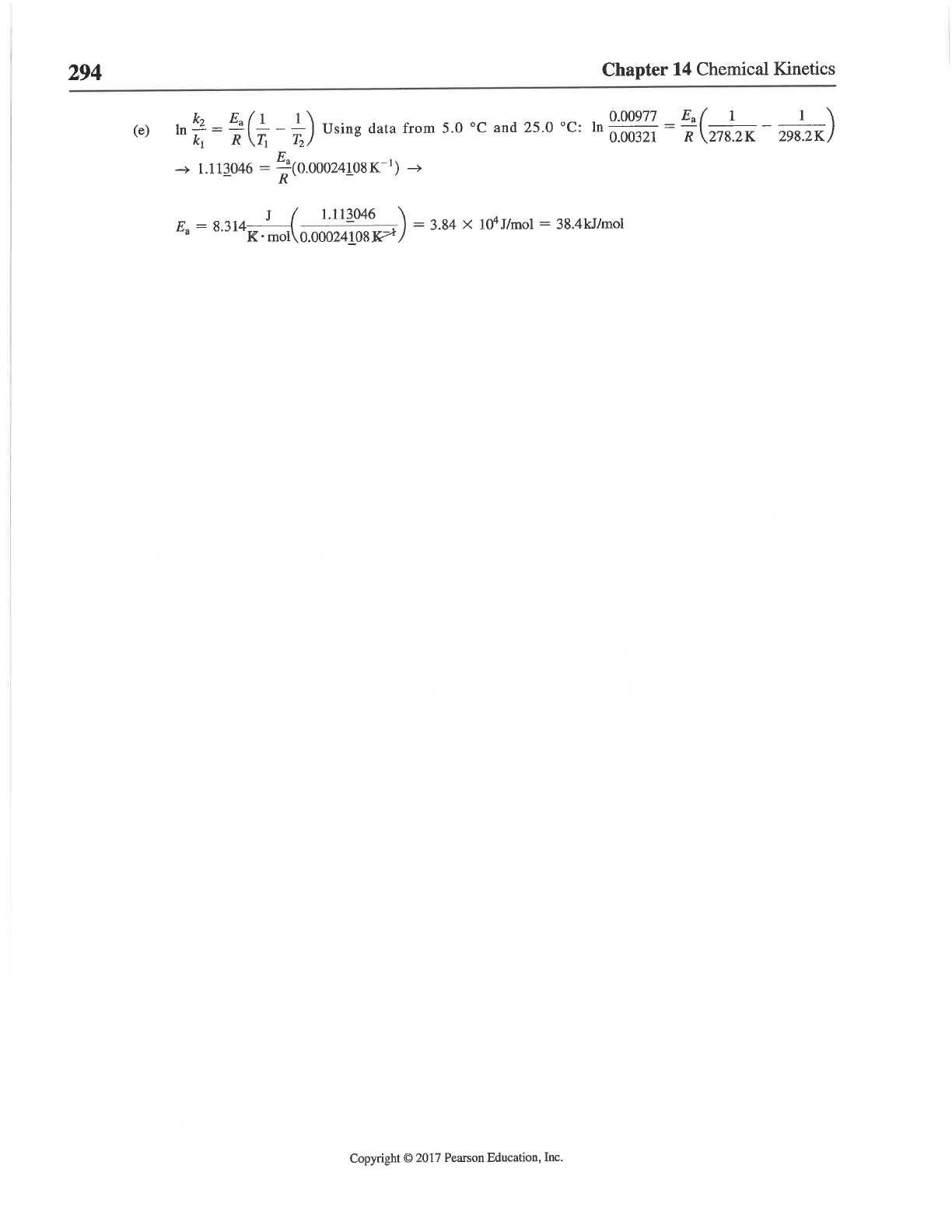 294 Chapter 14 Chemical Kinetics (e) In Using data from 5.0 °C and 25.0 °C: In 0.00321 0.00977 = R 1 298.2K 1 ) = 3.84 X 10⁴ J/mol = 38.4kJ/mol Copyright © 2017 Pearson Education, Inc.