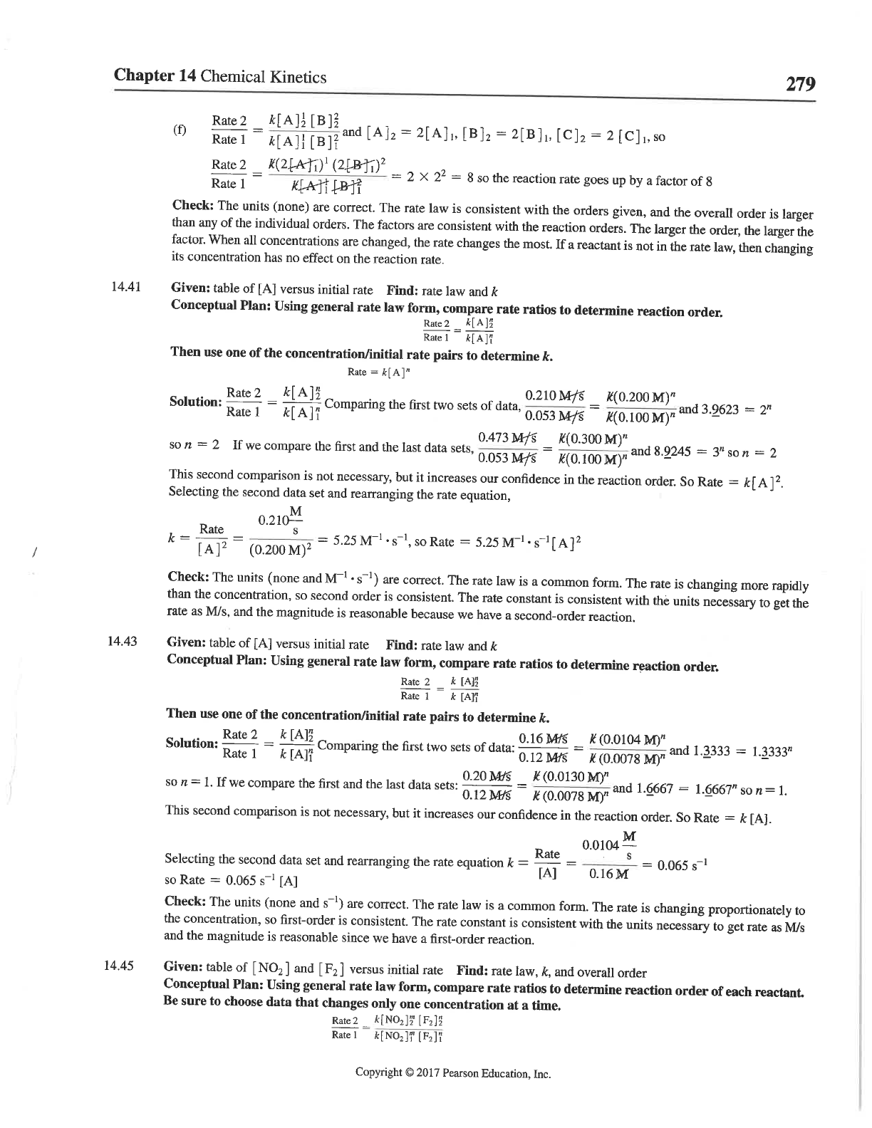 Chapter 14 Chemical Kinetics 279 Rate 2 (f) Rate 1 = and [B]₂ = = 2 Rate 1 Rate 2 = = = 8 so the reaction rate goes up by a factor of 8 Check: The units (none) are correct. The rate law is consistent with the orders given, and the overall order is larger than any of the individual orders. The factors are consistent with the reaction orders. The larger the order, the larger the factor. When all concentrations are changed, the rate changes the most. If a reactant is not in the rate law, then changing its concentration has no effect on the reaction rate. 14.41 Given: table of [A] versus initial rate Find: rate law and k Conceptual Plan: Using general rate law form, compare rate ratios to determine reaction order. Rate 2 = Rate 1 Then use one of the concentration/initial rate pairs to determine k. Rate = k[A]" Solution: Rate Rate 2 1 = Comparing the first two sets of data, 0.053 0.210 M/s M/s = and 3.9623 = 0.473 M/s If we compare the first and the last data sets, = and 8.9245 = 3" n = 2 0.053 M/s This second comparison is not necessary, but it increases our confidence in the reaction order. So Rate = Selecting the second data set and rearranging the rate equation, k = Rate = (0.200 = 5.25 so Rate = 5.25 Check: The units (none and M⁻¹ are correct. The rate law is a common form. The rate is changing more rapidly than the concentration, so second order is consistent. The rate constant is consistent with the units necessary to get the rate as M/s, and the magnitude is reasonable because we have a second-order reaction. 14.43 Given: table of [A] versus initial rate Find: rate law and k Conceptual Plan: Using general rate law form, compare rate ratios to determine reaction order. Rate 2 k Rate 1 = k Then use one of the rate pairs to determine k. Solution: Rate Rate 2 1 = Comparing the first two sets of data: 0.12 0.16 M/s = (0.0104 (0.0078 and 1.3333 = so n = 1. If we compare the first and the last data sets: 0.12 0.20 = (0.0078 (0.0130 and 1.6667 = n = 1. This second comparison is not necessary, but it increases our confidence in the reaction order. So Rate = k [A]. Selecting the second data set and rearranging the rate equation k = Rate [A] = 0.16M S = 0.065 so Rate = 0.065 [A] Check: The units (none and s⁻¹) are correct. The rate law is a common form. The rate is changing proportionately to the concentration, so first-order is consistent. The rate constant is consistent with the units necessary to get rate as M/s and the magnitude is reasonable since we have a first-order reaction. 14.45 Given: table of [NO₂] and [F₂] versus initial rate Find: rate law, k, and overall order Conceptual Plan: Using general rate law form, compare rate ratios to determine reaction order of each reactant. Be sure to choose data that changes only one concentration at a time. Rate 2 = Rate 1 Copyright © 2017 Pearson Education, Inc.