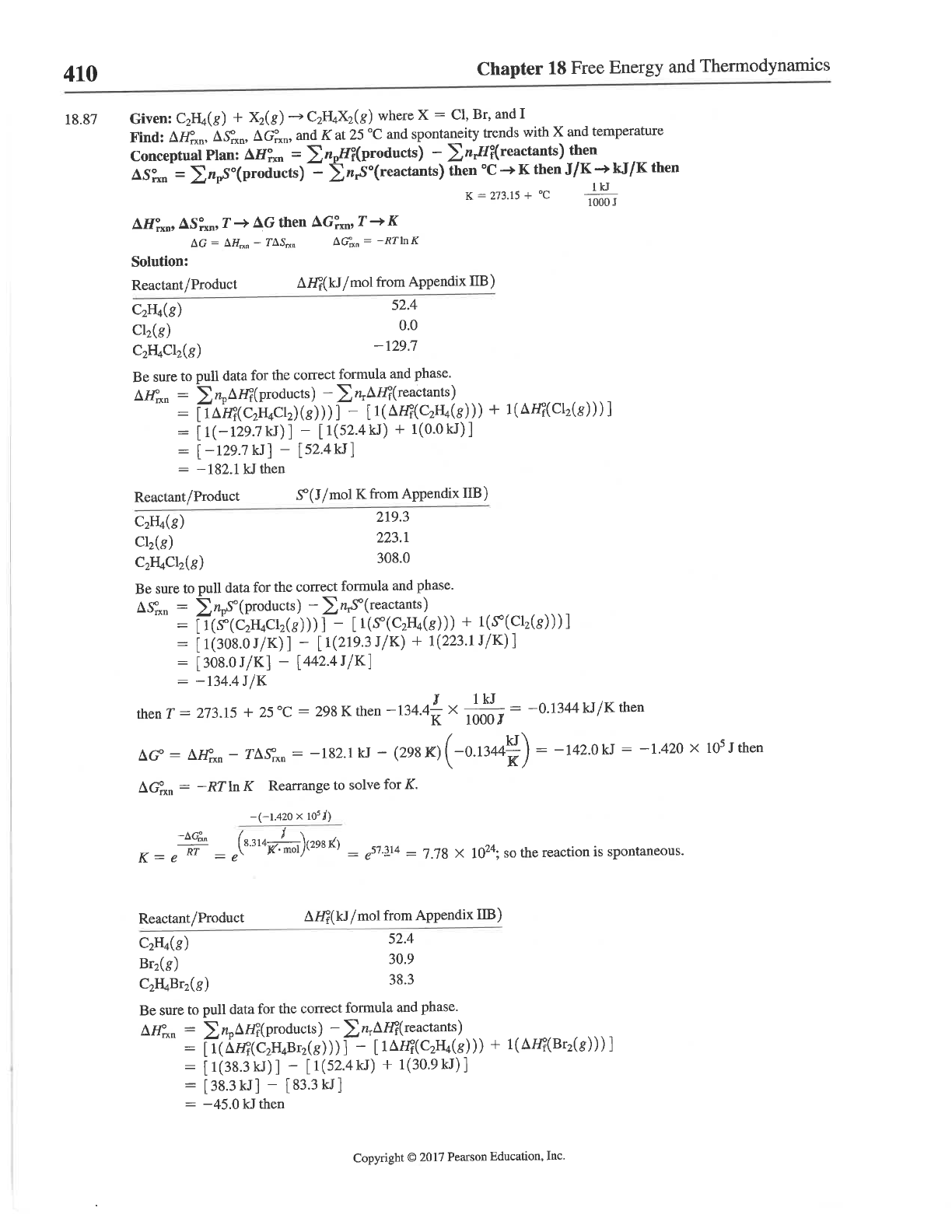 410 Chapter 18 Free Energy and Thermodynamics 18.87 Given: + C₂H₄X₂(₈) where X = Cl, Br, and I Find: and K at 25 °C and spontaneity trends with X and temperature Conceptual Plan: = - then = - then °C K then J/K kJ/K then 1kJ K = 273.15 + °C AG then K Solution: Reactant/Product from Appendix IIB) 52.4 0.0 C₂H₄Cl₂(₈) -129.7 Be sure to pull data for the correct formula and phase. = = + = [1(-129.7kJ)] - [1(52.4kJ) + = [52.4kJ] = -182.1 kJ then Reactant/Product K from Appendix IIB) 219.3 223.1 C₂H₄Cl₂(₈) 308.0 Be sure to pull data for the correct formula and phase. = = + = [1(308.0J/K)] [1(219.3J/K) + 1(223.1 J/K)] = [308.0J/K] [442.4J/K] = -134.4J/K then T = 273.15 + 25 °C = 298 K then = then = = 182.1 = -142.0kJ = -1.420 X 10⁵ J then = K Rearrange to solve for K. K = = 7.78 X 10²⁴; so the reaction is spontaneous. Reactant/Product from Appendix IIB) C₂H₄(₈) 52.4 Br₂(g) 30.9 38.3 Be sure to pull data for the correct formula and phase. = = + = [1(52.4kJ) + = [38.3kJ] - [83.3kJ] = -45.0kJ then Copyright © 2017 Pearson Education, Inc.