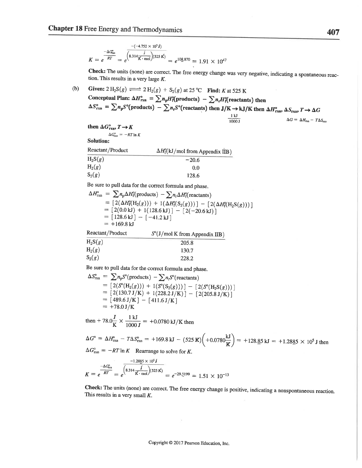 Chapter 18 Free Energy and Thermodynamics 407 K = e RT = = = 1.91 X 10⁴⁷ Check: The units (none) are correct. The free energy change was very negative, indicating a spontaneous reac- tion. This results in a very large K. (b) Given: 2H₂S(g) + at Find: K at 525 K Conceptual Plan: = - then = - then J/K kJ/K then T AG 1kJ then Solution: Reactant/Product from Appendix IIB) H₂S(g) -20.6 0.0 S₂(g) 128.6 Be sure to pull data for the correct formula and phase. = = + = [2(0.0kJ) + [2(-20.6kJ)] = [128.6kJ] [-41.2kJ] = +169.8kJ Reactant/Product K from Appendix IIB) 205.8 H₂(g) 130.7 S₂(g) 228.2 Be sure to pull data for the correct formula and phase. = = + = + 1(228.2J/K)] - = [489.6J/K] [411.6J/K] = +78.0J/K then = = = +169.8kJ = +128.85 kJ = +1.2885 X 10⁵ J then = K Rearrange to solve for K. K Check: The units (none) are correct. The free energy change is positive, indicating a nonspontaneous reaction. This results in a very small K. Copyright © 2017 Pearson Education, Inc.