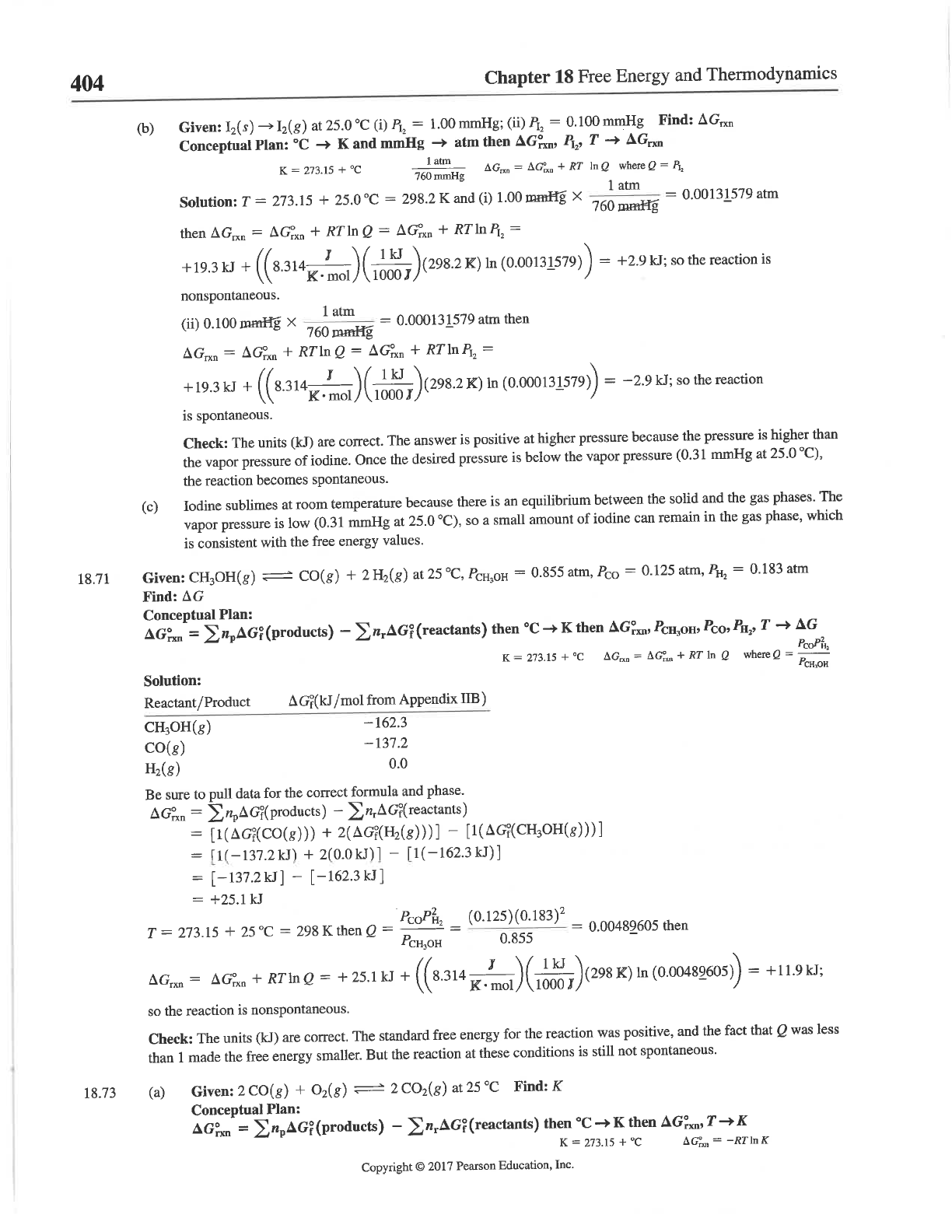 404 Chapter 18 Free Energy and Thermodynamics (b) Given: I₂(s) at 25.0 (i) = 1.00 mmHg; (ii) = 0.100 mmHg Find: Conceptual Plan: °C K and mmHg atm then T 1 atm K = 273.15 + °C = + RT In where = 760 mmHg 1 atm Solution: T = 273.15 + 25.0 °C = 298.2 K and (i) 1.00 mmHg X 760 mmHg = 0.00131579 atm then = + Q = + RT = +19.3 kJ + In = +2.9 kJ; the reaction is nonspontaneous. 1 atm (ii) 0.100 mmHg X 760 mmHg = 0.000131579 atm then = + Q = + RT = +19.3kJ + In = -2.9kJ; so the reaction is spontaneous. Check: The units (kJ) are correct. The answer is positive at higher pressure because the pressure is higher than the vapor pressure of iodine. Once the desired pressure is below the vapor pressure (0.31 mmHg at 25.0 °C), the reaction becomes spontaneous. (c) Iodine sublimes at room temperature because there is an equilibrium between the solid and the gas phases. The vapor pressure is low (0.31 mmHg at 25.0 °C), so a small amount of iodine can remain in the gas phase, which is consistent with the free energy values. 18.71 Given: CO(g) + at 25 °C, PCH₃OH = 0.855 atm, = 0.125 atm, PH₂ = 0.183 atm Find: Conceptual Plan: = - (reactants) then °C K then Pco, T AG K = 273.15 + °C = + RT In where Solution: Reactant/Product from Appendix IIB) CH₃OH(g) -162.3 CO(g) -137.2 0.0 Be sure to pull data for the correct formula and phase. = = + = + = [-137.2kJ] [-162.3kJ] = +25.1kJ T = 273.15 + = 298 K then Q = = 0.855 = 0.00489605 then = + RT In Q = + 25.1 kJ + In = +11.9kJ; so the reaction is nonspontaneous. Check: The units (kJ) are correct. The standard free energy for the reaction was positive, and the fact that Q was less than 1 made the free energy smaller. But the reaction at these conditions is still not spontaneous. 18.73 (a) Given: 2CO(g) + at 25 °C Find: K Conceptual Plan: = then °C K then T K K = 273.15 + °C = - K Copyright © 2017 Pearson Education, Inc.