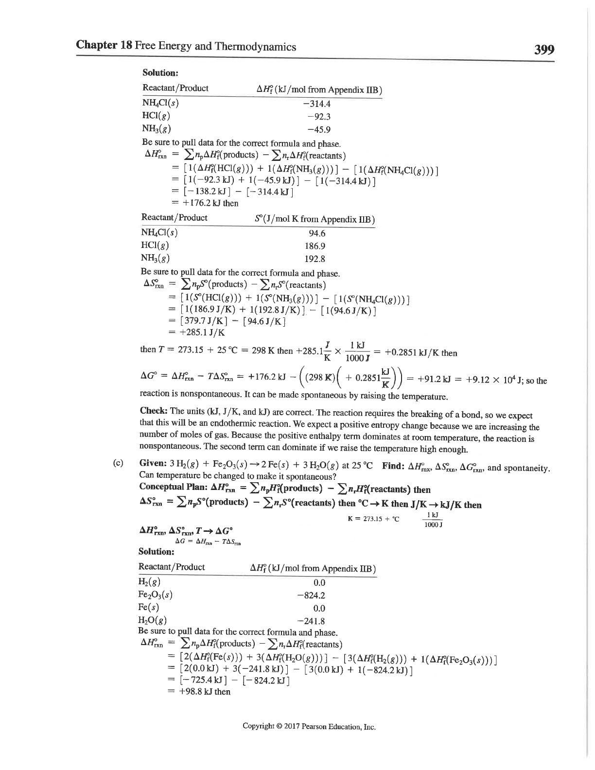 Chapter 18 Free Energy and Thermodynamics 399 Solution: Reactant/Product (kJ/mol from Appendix IIB) NH₄Cl(s) -314.4 HCl(g) -92.3 -45.9 Be sure to pull data for the correct formula and phase. = = + - = + 1(-45.9kJ)] [1(-314.4kJ)] = [-138.2kJ] [-314.4kJ] = +176.2kJ then Reactant/Product K from Appendix IIB) 94.6 HCl(g) 186.9 192.8 Be sure to pull data for the correct formula and phase. = (reactants) = + - = (1(186.9 J/K) + 1(192.8J/K)] [1(94.6J/K)] = [379.7J/K] [94.6J/K] = then T = 273.15 + 25 °C = 298 K then +285.1 K X 1000 J = +0.2851 kJ/K then = - = +176.2kJ = +91.2 kJ = +9.12 X 10⁴ J; so the reaction is nonspontaneous. It can be made spontaneous by raising the temperature. Check: The units (kJ, J/K, and kJ) are correct. The reaction requires the breaking of a bond, we expect that this will be an endothermic reaction. We expect a positive entropy change because we are increasing the number of moles of gas. Because the positive enthalpy term dominates at room temperature, the reaction is nonspontaneous. The second term can dominate if we raise the temperature high enough. (c) Given: + Fe₂O₃(s) 2Fe(s) + 3H₂O(g) at 25 °C Find: and spontaneity. Can temperature be changed to make it spontaneous? Conceptual Plan: = - then = - then K then J/K kJ/K then 1kJ K = 273.15 + °C 1000J Solution: Reactant/Product (kJ/mol from Appendix IIB) H₂(₈) 0.0 Fe₂O₃(s) -824.2 Fe(s) 0.0 H₂O(₈) -241.8 Be sure to pull data for the correct formula and phase. = = [2(AHᵢ(Fe(s))) + - + = [2(0.0kJ) + - [3(0.0kJ) + 1(-824.2kJ)] = [-725.4kJ] [-824.2kJ] = kJ then Copyright © 2017 Pearson Education, Inc.