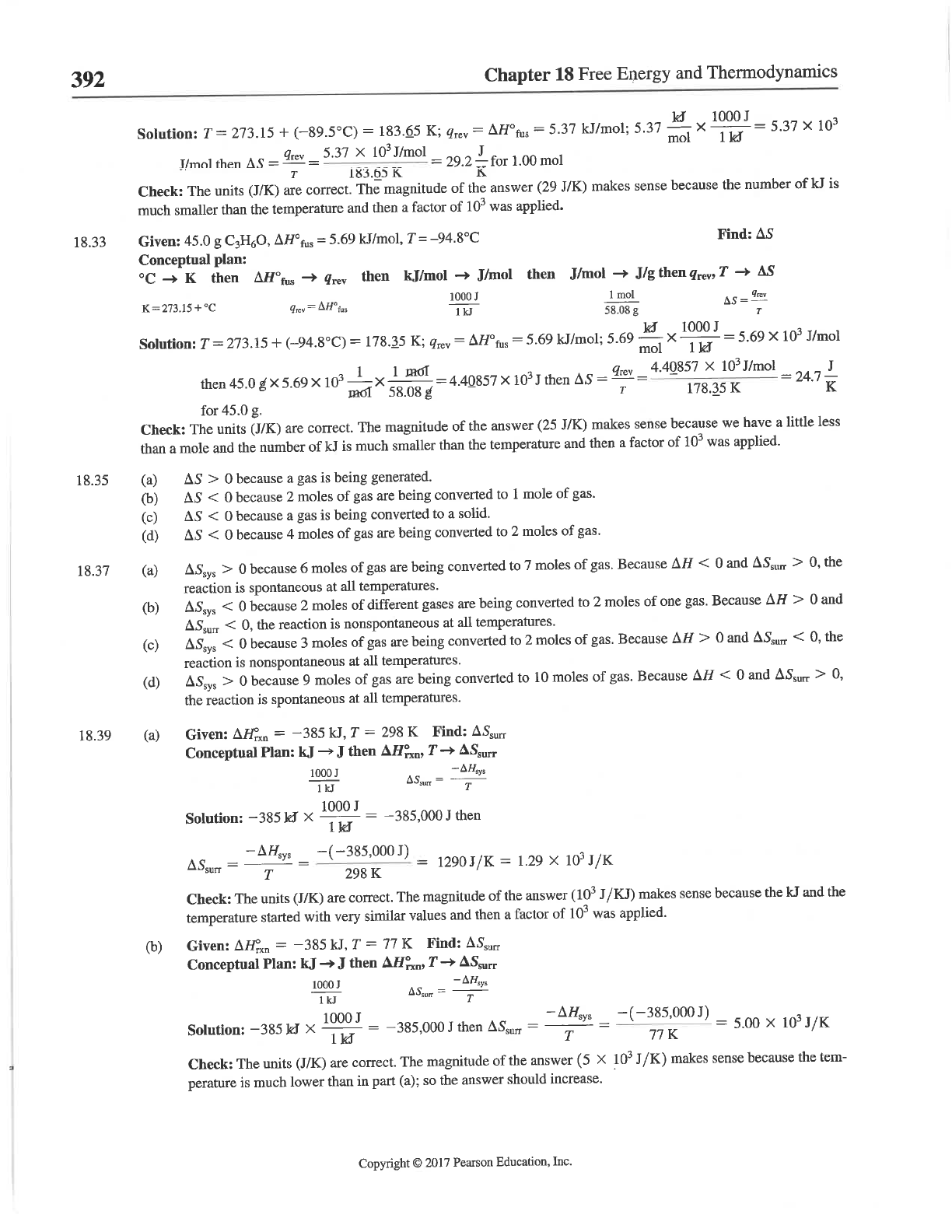 392 Chapter 18 Free Energy and Thermodynamics Solution: T = 273.15 + (-89.5°C) = 183.65 K; = fus = 5.37 kJ/mol; 5.37 5.37 then = T = 5.37 X = for 1.00 mol 183.65 K Check: The units (J/K) are correct. The magnitude of the answer (29 J/K) makes sense because the number of kJ is much smaller than the temperature and then a factor of 10³ was applied. 18.33 Given: 45.0 g C₃H₆O, fus = 5.69 kJ/mol, T = -94.8°C Find: Conceptual plan: °C K then fus then kJ/mol J/mol then J/mol J/g then T AS 1000J 1 mol 1kJ Solution: T = 273.15 + (-94.8°C) = 178.35 K; = fus = 5.69 kJ/mol; 5.69 mol X 1 kJ = 5.69 10³ J/mol then 45.0 g X 5.69 X 10³ 1 X 58.08 1 = 4.40857 10³ J then = T = 4.40857 X 10³ J/mol = 24.7 K J for 45.0 g. Check: The units (J/K) are correct. The magnitude of the answer (25 J/K) makes sense because we have a little less than a mole and the number of kJ is much smaller than the temperature and then a factor of 10³ was applied. 18.35 (a) > 0 because a gas is being generated. (b) S 0 because 6 moles of gas are being converted to 7 moles of gas. Because AH 0 and the reaction is nonspontaneous at all temperatures. (c) 0 and the reaction is nonspontaneous at all temperatures. (d) > 0 because 9 moles of gas are being converted to 10 moles of gas. Because AH the reaction is spontaneous at all temperatures. 18.39 (a) Given: = 385 kJ, T = 298 K Find: Conceptual Plan: kJ J then T Solution: -385 kJ = -385,000J then = T = = = 1.29 X J/K Check: The units (J/K) are correct. The magnitude of the answer (10³ J/KJ) makes sense because the kJ and the temperature started with very similar values and then a factor of 10³ was applied. (b) Given: = -385 kJ, = 77 K Find: Conceptual Plan: kJ J then Solution: -385 kJ X 1 = 385,000 then = T = -(-385,000J) 77 K = 5.00 J/K Check: The units (J/K) are correct. The magnitude of the answer (5 X 10³J/K) makes sense because the tem- perature is much lower than in part (a); so the answer should increase. Copyright © 2017 Pearson Education, Inc.