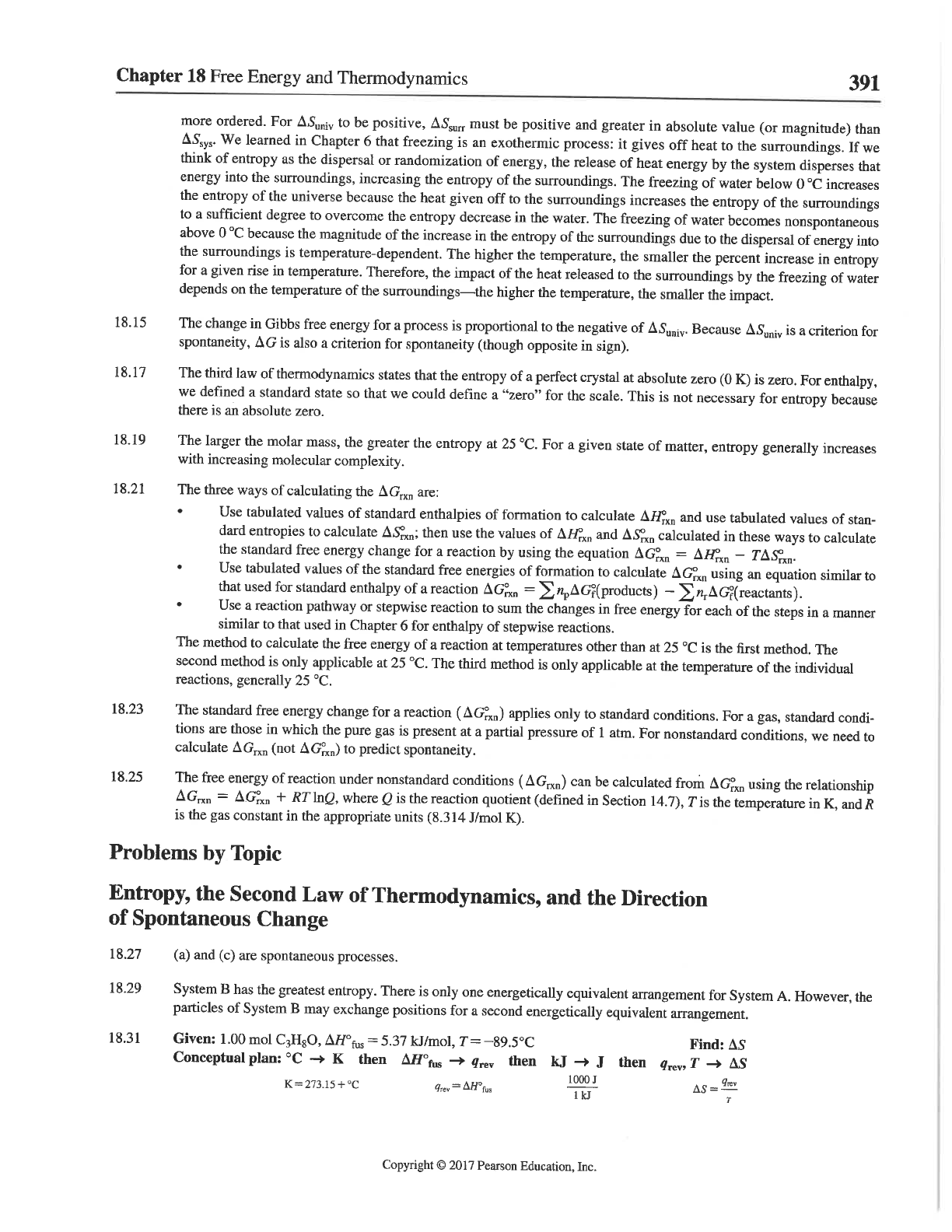 Chapter 18 Free Energy and Thermodynamics 391 more ordered. For to be positive, must be positive and greater in absolute value (or magnitude) than We learned in Chapter 6 that freezing is an exothermic process: it gives off heat to the surroundings. If we think of entropy as the dispersal or randomization of energy, the release of heat energy by the system disperses that energy into the surroundings, increasing the entropy of the surroundings. The freezing of water below increases the entropy of the universe because the heat given off to the surroundings increases the entropy of the surroundings to a sufficient degree to overcome the entropy decrease in the water. The freezing of water becomes nonspontaneous above because the magnitude of the increase in the entropy of the surroundings due to the dispersal of energy into the surroundings is temperature-dependent. The higher the temperature, the smaller the percent increase in entropy for a given rise in temperature. Therefore, the impact of the heat released to the surroundings by the freezing of water depends on the temperature of the surroundings-the higher the temperature, the smaller the impact. 18.15 The change in Gibbs free energy for a process is proportional to the negative of Because is a criterion for spontaneity, AG is also a criterion for spontaneity (though opposite in sign). 18.17 The third law of thermodynamics states that the entropy of a perfect crystal at absolute zero (0K) is zero. For enthalpy, we defined a standard state so that we could define a "zero" for the scale. This is not necessary for entropy because there is an absolute zero. 18.19 The larger the molar mass, the greater the entropy at 25 °C. For a given state of matter, entropy generally increases with increasing molecular complexity. 18.21 The three ways of calculating the are: Use tabulated values of standard enthalpies of formation to calculate and use tabulated values of stan- dard entropies to calculate then use the values of and calculated in these ways to calculate the standard free energy change for a reaction by using the equation = Use tabulated values of the standard free energies of formation to calculate using an equation similar to that used for standard enthalpy of a reaction = products) Use a reaction pathway or stepwise reaction to sum the changes in free energy for each of the steps in a manner similar to that used in Chapter 6 for enthalpy of stepwise reactions. The method to calculate the free energy of a reaction at temperatures other than at 25 °C is the first method. The second method is only applicable at 25 °C. The third method is only applicable at the temperature of the individual reactions, generally 25 °C. 18.23 The standard free energy change for a reaction applies only to standard conditions. For a gas, standard condi- tions are those in which the pure gas is present at a partial pressure of 1 atm. For nonstandard conditions, we need to calculate (not to predict spontaneity. 18.25 The free energy of reaction under nonstandard conditions can be calculated from using the relationship = + RT InQ, where Q is the reaction quotient (defined in Section 14.7), T is the temperature in K, and R is the gas constant in the appropriate units (8.314 J/mol K). Problems by Topic Entropy, the Second Law of Thermodynamics, and the Direction of Spontaneous Change 18.27 (a) and (c) are spontaneous processes. 18.29 System B has the greatest entropy. There is only one energetically equivalent arrangement for System A. However, the particles of System B may exchange positions for a second energetically equivalent arrangement. 18.31 Given: 1.00 mol C₃H₈O, fus = 5.37 kJ/mol, -89.5°C Find: S Conceptual plan: °C K then fus then kJ J then T K=273.15+°C = 1kJ Copyright © 2017 Pearson Education, Inc.