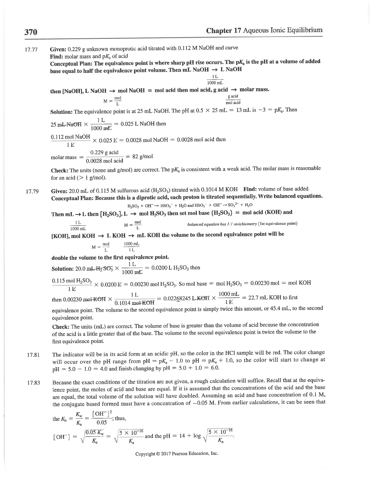 370 Chapter 17 Aqueous Ionic Equilibrium 17.77 Given: 0.229 g unknown monoprotic acid titrated with 0.112 M NaOH and curve Find: molar mass and pKₐ of acid Conceptual Plan: The equivalence point is where sharp pH rise occurs. The is the pH at a volume of added base equal to half the equivalence point volume. Then mL NaOH L NaOH 1L 1000 mL then [NaOH], L NaOH mol NaOH = mol acid then mol acid, g acid molar mass. g acid M L mol acid Solution: The equivalence point is at 25 mL NaOH. The pH at 0.5 X 25 mL = 13 mL is ~3 = pKₐ. Then 25 NaOH X 1000 1L = 0.025 L NaOH then 0.112 mol NaOH X 0.025 L = 0.0028 mol NaOH = 0.0028 mol acid then molar mass = 0.0028 0.229 mol g acid acid = 82 g/mol Check: The units (none and g/mol) are correct. The pKₐ is consistent with a weak acid. The molar mass is reasonable for an acid (> 1 g/mol). 17.79 Given: 20.0 mL of 0.115 M sulfurous acid (H₂SO₃) titrated with 0.1014 M KOH Find: volume of base added Conceptual Plan: Because this is a diprotic acid, each proton is titrated sequentially. Write balanced equations. H₂SO₃ + + and + + Then mL L then mol then set mol base = mol acid (KOH) and 1L M balanced equation has 1:1 stoichiometry (1st equivalence point) 1000 mL L [KOH], mol L KOH mL KOH the volume to the second equivalence point will be 1000 mL M L 1L double the volume to the first equivalence point. Solution: 20.0 X 1000 1L mL = 0.0200 L then 0.115 mol H₂SO₃ X 0.0200 L = 0.00230 mol So mol base = mol H₂SO₃ = 0.00230 mol = mol KOH then 0.00230 X 0.1014 1L = 0.02268245 LKOH X 1000 = 22.7 mL KOH to first equivalence point. The volume to the second equivalence point is simply twice this amount, or 45.4 mL, to the second equivalence point. Check: The units (mL) are correct. The volume of base is greater than the volume of acid because the concentration of the acid is a little greater that of the base. The volume to the second equivalence point is twice the volume to the first equivalence point. 17.81 The indicator will be in its acid form at an acidic pH, so the color in the sample will be red. The color change will occur over the pH range from pH = pKₐ - 1.0 to pH = pKₐ + 1.0, so the color will start to change at pH = 5.0 1.0 = 4.0 and finish changing by pH = 5.0 + 1.0 = 6.0. 17.83 Because the exact conditions of the titration are not given, a rough calculation will suffice. Recall that at the equiva- lence point, the moles of acid and base are equal. If it is assumed that the concentrations of the acid and the base are equal, the total volume of the solution will have doubled. Assuming an acid and base concentration of 0.1 M, the conjugate based formed must have a concentration of ~0.05 M. From earlier calculations, it can be seen that the Kb = Kw = 0.05 thus, = 0.05 = 5 and the pH = 14 log Copyright © 2017 Pearson Education, Inc.