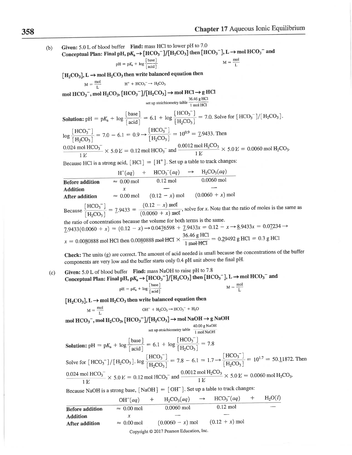 358 Chapter 17 Aqueous Ionic Equilibrium (b) Given: 5.0 L of blood buffer Find: mass to lower pH to 7.0 Conceptual Plan: Final pH, then [HCO₃⁻],L mol and [base] pH = + L [H₂CO₃], L mol H₂CO₃ then write balanced equation then M + L mol mol mol HCI g HCI 36.46 HCI set up stoichiometry table 1 mol HCI Solution: pH = = 6.1 + = 7.0. Solve for log = 7.0 6.1 = 0.9 = = 7.9433. Then [H₂CO₃] [H₂CO₃] 0.024 mol X = 0.12 mol and 0.0012 mol X 5.0 L = 0.0060 mol H₂CO₃. L Because is a strong acid, [HCI] = [H⁺]. Set up a table to track changes: + H₂CO₃(aq) Before addition ≈ 0.00 mol 0.12 mol 0.0060 mol Addition - x After addition ≈ 0.00 mol (0.12 x) mol (0.0060 + x) mol Because [HCO₃⁻] [H₂CO₃] = 7.9433 = (0.0060 (0.12 + x) solve for Note that the ratio of moles is the same as the ratio of concentrations because the volume for both terms is the same. 7.9433(0.0060 + x) = (0.12 x) 0.0476598 + 7.9433x = 0.12 x 8.9433x = 0.07234 x = 0.0080888 mol then 0.0080888 X 36.46 g = 0.29492 g HCI = 0.3 g 1 Check: The units (g) are correct. The amount of acid needed is small because the concentrations of the buffer components are very low and the buffer starts only 0.4 pH unit above the final pH. (c) Given: 5.0 L of blood buffer Find: mass NaOH to raise pH to 7.8 Conceptual Plan: Final pH, pKₐ then mol and M L mol then write balanced equation then + + mol mol mol NaOH g NaOH 40.00 g NaOH set up stoichiometry table 1 mol NaOH Solution: pH = log = 6.1 + [H₂CO₃] = 7.8 Solve for [HCO₃⁻] = 7.8 6.1 = 1.7 [H₂CO₃] = 10¹.⁷ = 50.11872. Then 0.024 mol X = 0.12 mol and 0.0012 mol 1L X = 0.0060 mol H₂CO₃. Because NaOH is a strong base, [NaOH] = Set up a table to track changes: OH⁻(aq) + H₂CO₃(aq) + Before addition ≈ 0.00 mol 0.0060 mol 0.12 mol Addition x After addition ≈ 0.00 mol (0.0060 x) mol (0.12 + x) mol Copyright © 2017 Pearson Education, Inc.