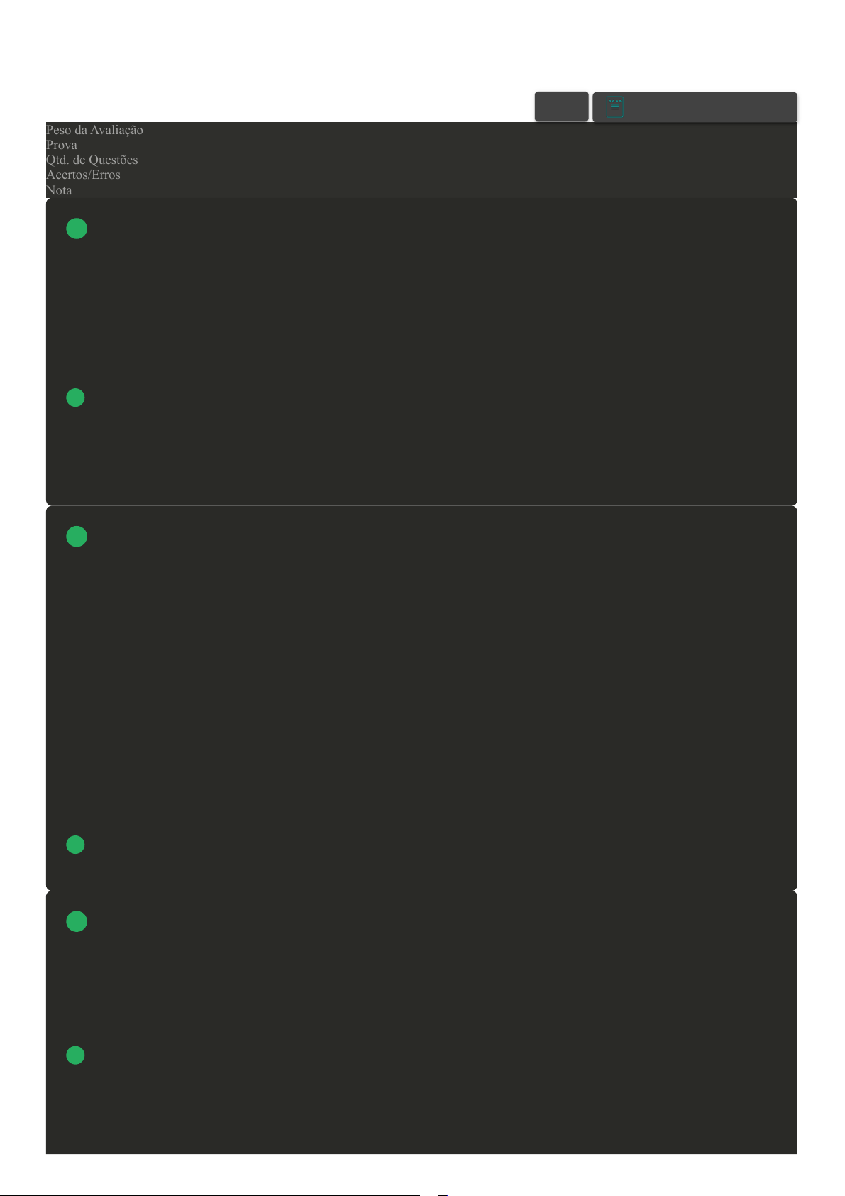 15/03/2024, 10:23 Avaliação I - Individual about:blank 1/4 Prova Impressa GABARITO | Avaliação I - Individual (Cod.:957123) Peso da Avaliação 2,00 Prova 76449612 Qtd. de Questões 10 Acertos/Erros 10/0 Nota 10,00 O agulhamento a seco é um tratamento de grande valia para pacientes com síndrome de dor miofascial na coluna cervical, devido a sua eficácia na melhora de dor local ou referida, relaxamento muscular e amplitude de movimento dos músculos cervicais. A combinação desses benefícios se reflete na qualidade de vida desses pacientes (FONTANA; ARAÚJO; STIEVEN, 2018). Sobre a amplitude de movimento da coluna cervical, assinale a alternativa CORRETA: FONTE: FONTANA, D. F., ARAÚJO, R. S.; STIEVEN, F. F. O Agulhamento a seco no tratamento da dor miofascial em pontos- gatilho na coluna cervical: uma revisão sistemática de ensaios clínicos randomizados. Revista Inspirar, Rio Grande do Sul, v. 17, n. 3, p. 1-10, set. 2018. Disponível em: https://bit.ly/2ZdhygK. Acesso em: 28 jun. 2020. A Flexão de 0 a 45 graus; extensão de 0 a 70 graus; flexão lateral de 0 a 45 graus e rotação de 0 a 90 graus. B Flexão de 0 a 90 graus; extensão de 0 a 70 graus; flexão lateral de 0 a 45 graus e rotação de 0 a 90 graus. C Flexão de 0 a 90 graus; extensão de 0 a 45 graus; flexão lateral de 0 a 45 graus e rotação de 0 a 90 graus. D Flexão de 0 a 90 graus; extensão de 0 a 70 graus; flexão lateral de 0 a 45 graus e rotação de 0 a 30 graus. [Laboratório virtual - Movimentos da articulação do quadril] A avaliação do fisioterapeuta envolve a realização da anamnese e do exame físico do paciente. Na etapa de exame físico, tem-se, dentre outros aspectos a serem avaliados, a análise da amplitude de movimento. Fundamentando-se na análise de amplitude de movimento do quadril, realizada durante o exame físico, assinale a alternativa CORRETA que apresenta o músculo que pode estar envolvido com a limitação do movimento de abdução do quadril: A Piriforme. B Glúteo mínimo. C Sartório. D Glúteo médio. O envelhecimento populacional é uma realidade enfrentada em todo o mundo, e o Brasil não está fora. Osteoporose foi por muitos anos considerada uma doença da mulher pós-menopausada. O homem tem diversos fatores de desenvolvimento e hormonais que diferenciam a maturação do esquelético, com influência na incidência de osteoporose e fraturas (GUARNIERO; OLIVEIRA, 2004). Sobre os critérios de diagnóstico da osteoporose através da Densidade Mineral Óssea na população jovem, assinale a alternativa CORRETA: FONTE: GUARNIERO, R., OLIVEIRA, L. G. Osteoporose: atualização no diagnóstico e princípios básicos para o tratamento. Rev. Bras. Ortop. v. 9, n. 39, p. 477-485, 2004. A Abaixo de -2,5. B Abaixo de -1,1. C Abaixo de -1,5. VOLTAR A+ Alterar modo de visualização 1 2 3 15/03/2024, 10:23 Avaliação I - Individual about:blank 2/4 D Abaixo de -2,3. Para que um tratamento tenha um bom resultado, é necessária uma avaliação bem planejada e conduzida, abrangendo todas as informações necessárias. Um programa de fisioterapia efetivo começa com uma coleta de informações sobre o paciente, de modo a poder avaliar com precisão a gravidade da disfunção apresentada e determinar se ele será beneficiado com a fisioterapia. Uma avaliação ampla e minuciosa é essencial para a construção de um plano de tratamento adequado para as necessidades e limitações de cada paciente (BARBOSA et al., 2006). Sobre a palpação, analise as sentenças a seguir: I- Para verificar a temperatura da pele, você deve deslocar a pele e os tecidos moles com as pontas dos dedos. II- O objetivo da palpação é avaliar a sensibilidade e flexibilidade dos tecidos. III- Para verificar a mobilidade miofacial, você deve utilizar o dorso da mão. IV- Na palpação, você utilizará pressão leve para palpar a pele e utilizará pressão mais forte para palpar ossos. Assinale a alternativa CORRETA: FONTE: BARBOSA, Andreane Daniele et al. Avaliação fisioterapêutica aquática. Fisioterapia em Movimento, Curitiba, v. 19, n. 2, p. 135-147, abr. 2006. Disponível em: https://periodicos.pucpr.br/index.php/fisio/article/view/18723/18144. Acesso em: 21 jun. 2020. A As sentenças I e III estão corretas. B As sentenças I e IV estão corretas. C As sentenças II e IV estão corretas. D As sentenças II e III estão corretas. A dor lombar representa, hoje, uma das principais queixas na clínica diária. As consequências econômicas da lombalgia foram estimadas nos Estados Unidos em gastos de 16 a 50 bilhões de dólares por ano. Nesses gastos estão incluídos serviços de saúde e prejuízos pela falta no trabalho (BARBOSA et al., 2002). Sobre a avaliação da amplitude de movimento da coluna lombar, assinale a alternativa CORRETA: FONTE: BARBOSA, Luís Guilherme et al. Prevalência de lombalgia em acadêmicos de fisioterapia no ambulatório de um hospital universitário. Fisioterapia Brasil, Rio de Janeiro, v. 3, n. 6, p. 371-376, nov. 2002. Disponível em: http://www.portalatlanticaeditora.com.br/index.php/fisioterapiabrasil/article/view/2986. Acesso em: 25 jun. 2020. A Goniometria, mensuração com fita métrica, análise radiológica. B Mensuração com fita métrica, análise radiológica, eletrocardiograma. C Análise radiológica, pesquisa de anticorpos anti-Rh, goniometria. D Hemograma, mensuração com fita métrica, análise radiológica. A cervicalgia afeta um número significativo de indivíduos, com maior incidência no sexo feminino, acometendo cerca de 30% de homens e 43% de mulheres em algum momento de suas vidas. Atualmente, é considerada um dos problemas osteomusculares mais caros, com enorme impacto sobre a saúde e qualidade de vida dos indivíduos e na sociedade como um todo (KAPRELI et al., 2009). Sobre a avaliação da coluna cervical, classifique V para as sentenças verdadeiras e F para as falsas: ( ) O Teste de Compressão de Spurling avalia dor e compressão de rai