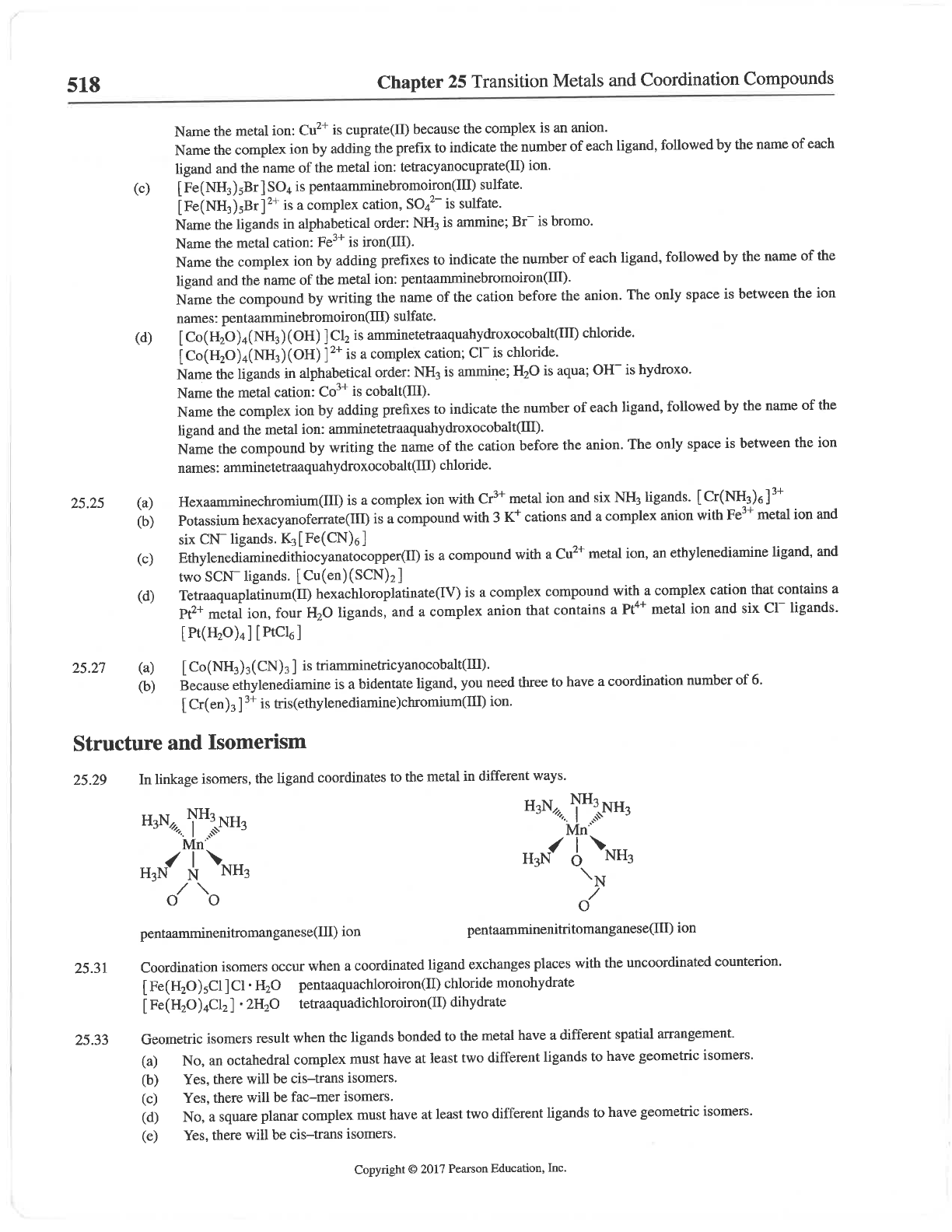 518 Chapter 25 Transition Metals and Coordination Compounds Name the metal ion: Cu²⁺ is cuprate(II) because the complex is an anion. Name the complex ion by adding the prefix to indicate the number of each ligand, followed by the name of each ligand and the name of the metal ion: tetracyanocuprate(II) ion. (c) is pentaamminebromoiron(II) sulfate. is a complex cation, is sulfate. Name the ligands in alphabetical order: NH₃ is ammine; Br⁻ is bromo. Name the metal cation: Fe³⁺ is iron(III). Name the complex ion by adding prefixes to indicate the number of each ligand, followed by the name of the ligand and the name of the metal ion: pentaamminebromoiron(II). Name the compound by writing the name of the cation before the anion. The only space is between the ion names: pentaamminebromoiron(II) sulfate. (d) is chloride. is a complex cation; is chloride. Name the ligands in alphabetical order: NH₃ is ammine; H₂O is aqua; OH⁻ is hydroxo. Name the metal cation: Co³⁺ is cobalt(III). Name the complex ion by adding prefixes to indicate the number of each ligand, followed by the name of the ligand and the metal ion: Name the compound by writing the name of the cation before the anion. The only space is between the ion names: chloride. 25.25 (a) Hexaamminechromium(III) is a complex ion with Cr³⁺ metal ion and six NH₃ ligands. (b) Potassium is a compound with 3 cations and a complex anion with Fe³⁺ metal ion and six ligands. (c) is a compound with a Cu²⁺ metal ion, an ethylenediamine ligand, and two ligands. (d) is a complex compound with a complex cation that contains a Pt²⁺ metal ion, four H₂O ligands, and a complex anion that contains a Pt⁴⁺ metal ion and six ligands. 25.27 (a) is (b) Because ethylenediamine is a bidentate ligand, you need three to have a coordination number of 6. is ion. Structure and Isomerism 25.29 In linkage isomers, the ligand coordinates to the metal in different ways. NH₃ Mn Mn H3N NH₃ N NH₃ N ion ion 25.31 Coordination isomers occur when a coordinated ligand exchanges places with the uncoordinated counterion. pentaaquachloroiron(II) chloride monohydrate [Fe(H₂O)₄Cl₂] tetraaquadichloroiron(II) dihydrate 25.33 Geometric isomers result when the ligands bonded to the metal have a different spatial arrangement. (a) No, an octahedral complex must have at least two different ligands to have geometric isomers. (b) Yes, there will be cis-trans isomers. (c) Yes, there will be fac-mer isomers. (d) No, a square planar complex must have at least two different ligands to have geometric isomers. (e) Yes, there will be cis-trans isomers. Copyright © 2017 Pearson Education, Inc.