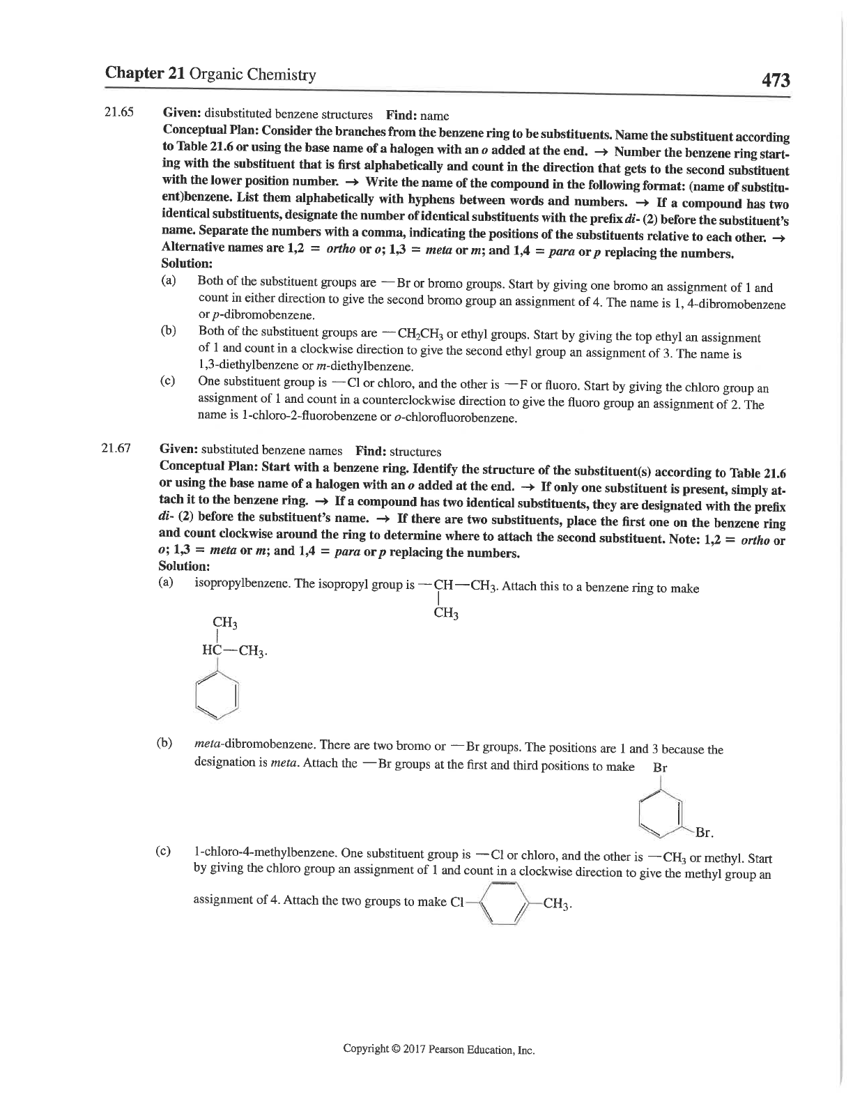 Chapter 21 Organic Chemistry 473 21.65 Given: disubstituted benzene structures Find: name Conceptual Plan: Consider the branches from the benzene ring to be substituents. Name the substituent according to Table 21.6 or using the base name of a halogen with an added at the end. Number the benzene ring start- ing with the substituent that is first alphabetically and count in the direction that gets to the second substituent with the lower position number. Write the name of the compound in the following format: (name of substitu- ent)benzene. List them alphabetically with hyphens between words and numbers. If a compound has two identical substituents, designate the number of identical substituents with the prefix di- (2) before the substituent's name. Separate the numbers with a comma, indicating the positions of the substituents relative to each other. Alternative names are 1,2 = ortho or o; 1,3 = meta or m; and 1,4 = para or p replacing the numbers. Solution: (a) Both of the substituent groups are Br or bromo groups. Start by giving one bromo an assignment of 1 and count in either direction to give the second bromo group an assignment of 4. The name is 1, 4-dibromobenzene or p-dibromobenzene. (b) Both of the substituent groups are CH₂CH₃ or ethyl groups. Start by giving the top ethyl an assignment of 1 and count in a clockwise direction to give the second ethyl group an assignment of 3. The name is 1,3-diethylbenzene or m-diethylbenzene. (c) One substituent group is or chloro, and the other is F or fluoro. Start by giving the chloro group an assignment of 1 and count in a counterclockwise direction to give the fluoro group an assignment of 2. The name is or o-chlorofluorobenzene. 21.67 Given: substituted benzene names Find: structures Conceptual Plan: Start with a benzene ring. Identify the structure of the substituent(s) according to Table 21.6 or using the base name of a halogen with an 0 added at the end. If only one substituent is present, simply at- tach it to the benzene ring. If a compound has two identical substituents, they are designated with the prefix di- (2) before the substituent's name. If there are two substituents, place the first one on the benzene ring and count clockwise around the ring to determine where to attach the second substituent. Note: 1,2 = ortho or o; 1,3 = meta or m; and 1,4 = para or p replacing the numbers. Solution: (a) isopropylbenzene. The isopropyl group is CH CH₃. Attach this to a benzene ring to make CH₃ CH₃ (b) meta-dibromobenzene. There are two bromo or - Br groups. The positions are 1 and 3 because the designation is meta. Attach the Br groups at the first and third positions to make Br Br. (c) One substituent group is - or chloro, and the other is CH₃ or methyl. Start by giving the chloro group an assignment of 1 and count in a clockwise direction to give the methyl group an assignment of 4. Attach the two groups to make CH₃. Copyright © 2017 Pearson Education, Inc.