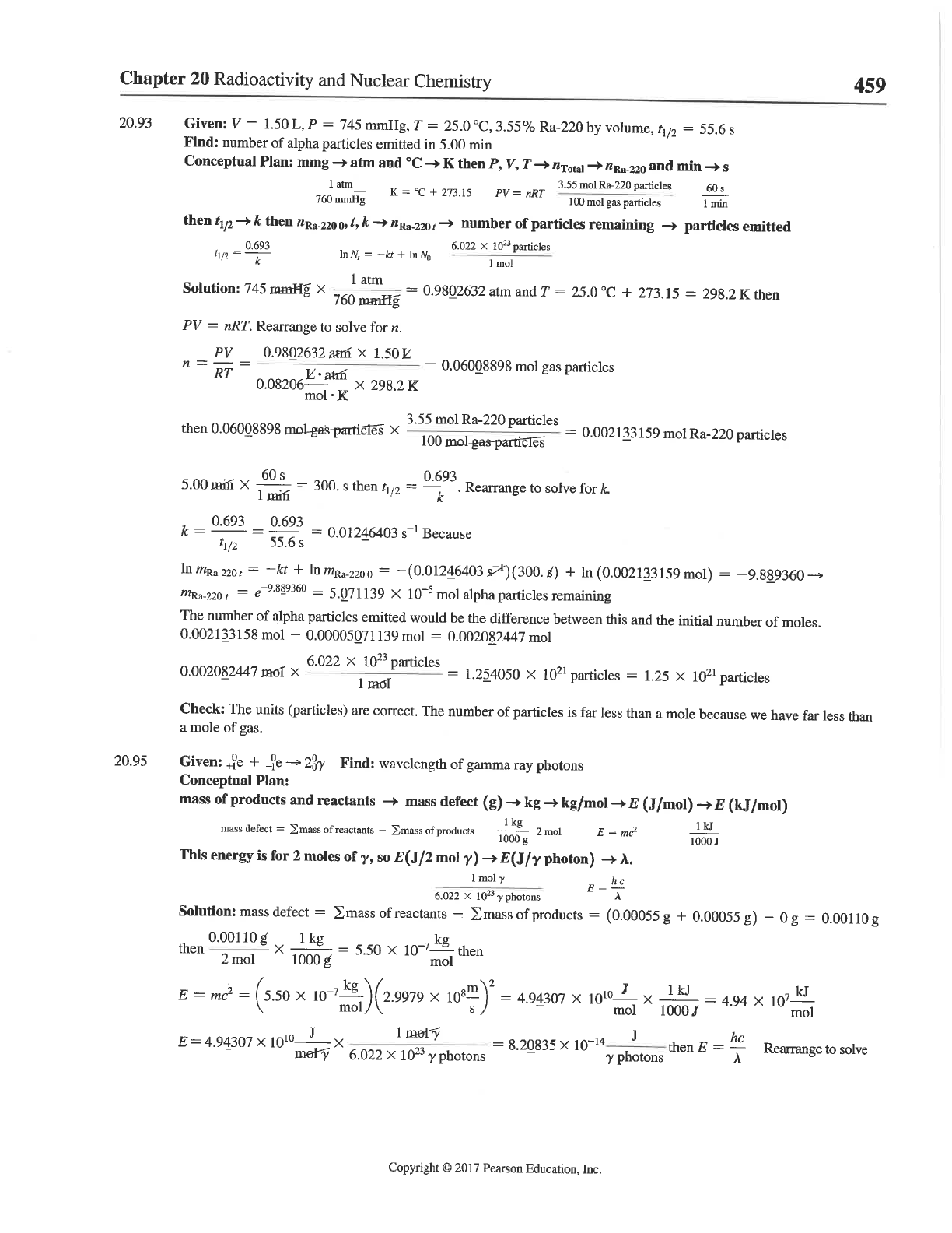 Chapter 20 Radioactivity and Nuclear Chemistry 459 20.93 Given: V = 1.50L, P = 745 mmHg, T = 25.0 °C, 3.55% Ra-220 by volume, = 55.6 S Find: number of alpha particles emitted in 5.00 min Conceptual Plan: mmg atm and °C K then P, V, T and min S 1 atm 3.55 mol Ra-220 particles 60 PV = nRT 760 mmHg 100 mol gas particles 1 min then k then t, k number of particles remaining particles emitted 6.022 X particles In = + In N₀ 1 mol 1 atm Solution: 745 mmHg X 760 = 0.9802632 atm and T = 25.0 °C + 273.15 = 298.2 K then mmHg PV = nRT. Rearrange to solve for n. n = PV RT = 0.9802632 atm atm X = 0.06008898 mol gas particles 0.08206 K 3.55 mol Ra-220 particles then 0.06008898 X = 0.002133159 mol Ra-220 particles 5.00 min X 1 min = 300. S then 1/2 = 0.693 k Rearrange to solve for k. k = 0.693 = 0.693 = 0.01246403 Because In = -kt + In = (0.01246403 st) (300. + In (0.002133159 mol) = -9.889360 = e -9.889360 = 5.071139 X 10⁻⁵ mol alpha particles remaining The number of alpha particles emitted would be the difference between this and the initial number of moles. 0.002133158 mol - 0.00005071139 mol = 0.002082447 mol 0.002082447 X 6.022 X 10²³ particles = 1.254050 X 10²¹ particles = 1.25 X 10²¹ particles 1 mot Check: The units (particles) are correct. The number of particles is far less than a mole because we have far less than a mole of gas. 20.95 Given: + Find: wavelength of gamma ray photons Conceptual Plan: mass of products and reactants mass defect (g) kg kg/mol E (J/mol) E (kJ/mol) mass defect = Σmass of reactants - Σmass of products 1kJ 2 mol E 1000J This energy is for 2 moles of γ, E(J/2 mol γ) E(J/γ photon) A. 1 mol y 6.022 X photons E Solution: mass defect = Σmass of reactants Σmass of products = (0.00055 g + 0.00055 g) 0g = 0.00110 g then 2 mol kg = 5.50 X mol kg then E = = 5.50 X mol X S = 4.94307 X 10¹⁰ mol J X 1kJ = 4.94 X mol kJ E = 4.94307 X 10¹⁰ J X 6.022 10²³ γ photons = 8.20835 X 10⁻¹⁴ γ photons J then E = hc Rearrange to solve 1 Copyright © 2017 Pearson Education, Inc.