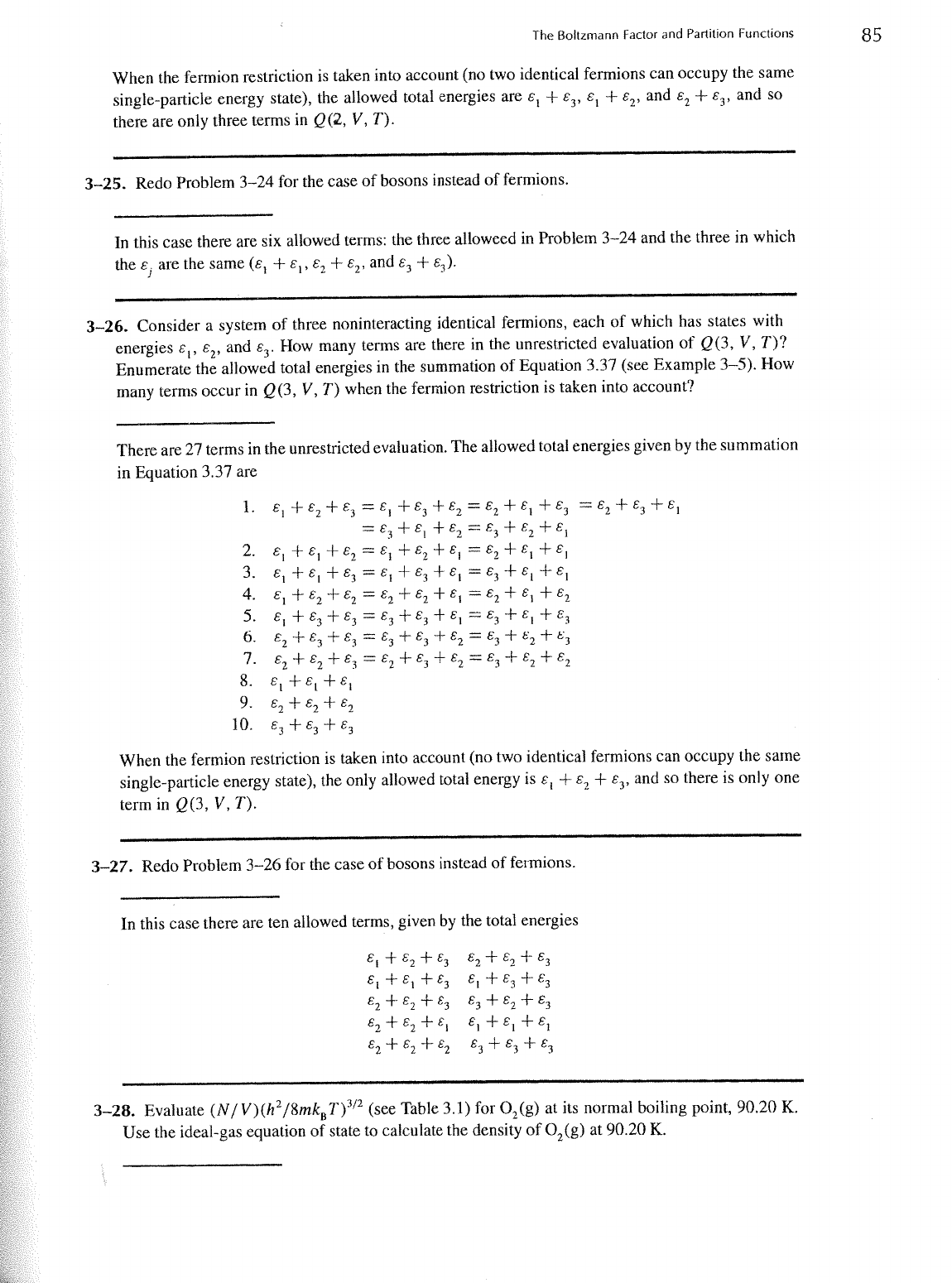 The Boltzmann Factor and Partition Functions 85 When the fermion restriction is taken into account (no two identical fermions can occupy the same single-particle energy state), the allowed total energies are ε₁ ε₁ and + and so there are only three terms in Q(2, V, T). 3-25. Redo Problem 3-24 for the case of bosons instead of fermions. In this case there are six allowed terms: the three alloweed in Problem 3-24 and the three in which the are the same ε₂ ε₂, and 3-26. Consider a system of three noninteracting identical fermions, each of which has states with energies ε₁, ε₂, and How many terms are there in the unrestricted evaluation of Q(3, V, T)? Enumerate the allowed total energies in the summation of Equation 3.37 (see Example 3-5). How many terms occur in Q(3, V, T) when the fermion restriction is taken into account? There are 27 terms in the unrestricted evaluation. The allowed total energies given by the summation in Equation 3.37 are 1. + ε₃ + + = = 2. = 3. = = 4. = = 5. = = 6. = = = = 8. 9. 10. When the fermion restriction is taken into account (no two identical fermions can occupy the same single-particle energy state), the only allowed total energy is and so there is only one term in Q(3, V, T). 3-27. Redo Problem 3-26 for the case of bosons instead of fermions. In this case there are ten allowed terms, given by the total energies 3-28. Evaluate (see Table 3.1) for O₂(g) at its normal boiling point, 90.20 K. Use the ideal-gas equation of state to calculate the density of O₂(g) at 90.20 K.
