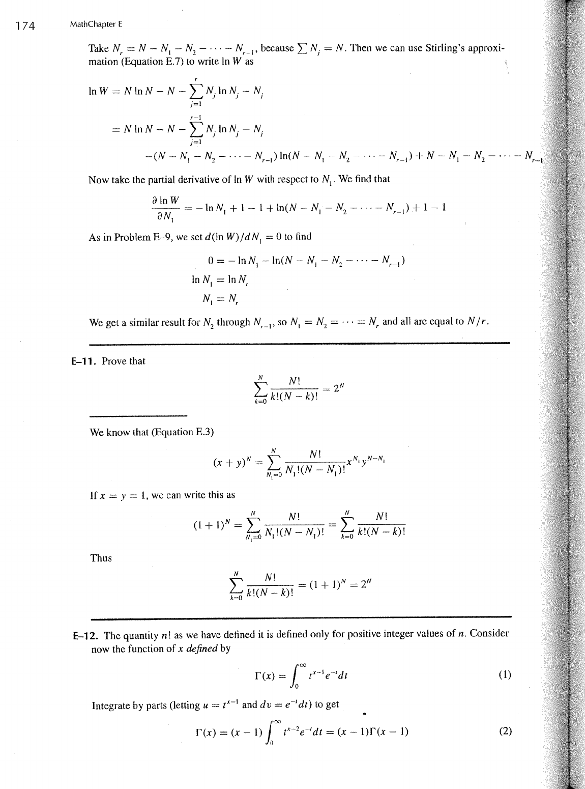 174 MathChapter E Take N, = N N₁ N₂ - because Σ Nⱼ = N. Then we can use Stirling's approxi- mation (Equation E.7) to write In W as In W = N In N N Nⱼ In Nⱼ Nⱼ j=1 (N N₁ N₂ In(N N₁ N₂ ... + N N₁ N₂ ... Now take the partial derivative of In W with respect to N₁. We find that In W = - In N₁ + 1 1 + N₁ N₂ ... - As in Problem E-9, we set d(In W)/dN₁ = 0 to find = We get a similar result for N₂ through so N₁ = N₂ N, and all are equal to N/r. E-11. Prove that N k=0 We know that (Equation E.3) N If = y = 1, we can write this as Thus N k=0 E-12. The quantity n! as we have defined it is defined only for positive integer values of n. Consider now the function of x defined by = (1) Integrate by parts (letting и = and dv = e dt) to get = (x 1) 0 dt = (x 1) (2)