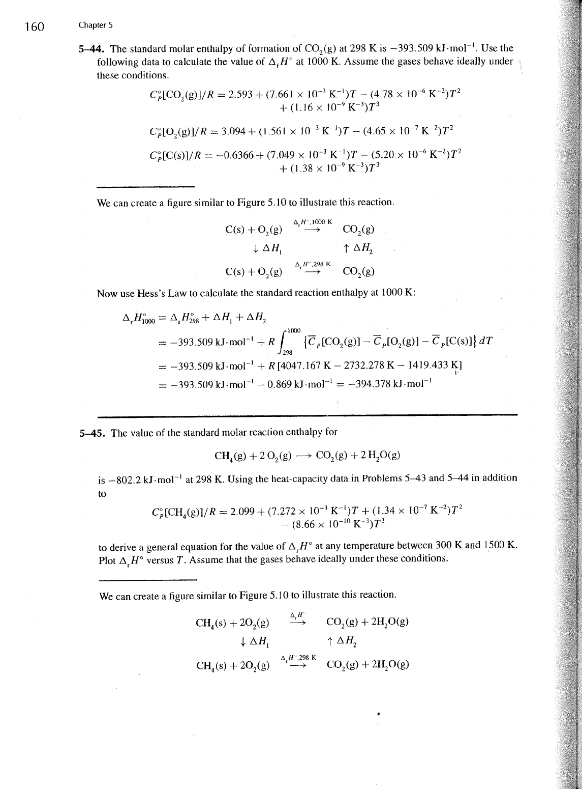 160 Chapter 5 5-44. The standard molar enthalpy of formation of CO₂(g) at 298 K is -393.509 Use the following data to calculate the value of at 1000 K. Assume the gases behave ideally under these conditions. = 2.593 + (7.661 X 10⁻³ K⁻¹)T - (4.78 X 10⁻⁶ = 3.094 + (1.561 X 10⁻³ (4.65 X 10⁻⁷ K⁻²)T² = -0.6366 + (7.049 X 10⁻³ - (5.20 X 10⁻⁶ + (1.38 X We can create a figure similar to Figure 5.10 to illustrate this reaction. CO₂(g) C(s) + O₂(g) CO₂(g) Now use Hess's Law to calculate the standard reaction enthalpy at 1000 K: = -393.509 + R 298 1000 - - dT = -393.509 + R [4047.167 K 2732.278 1419.433 = -393.509 0.869 = -394.378 5-45. The value of the standard molar reaction enthalpy for + is -802.2 at 298 K. Using the heat-capacity data in Problems 5-43 and 5-44 in addition to = 2.099 + (7.272 X 10⁻³ + (1.34 X 10⁻⁷ to derive a general equation for the value of at any temperature between 300 K and 1500 K. Plot H° versus T. Assume that the gases behave ideally under these conditions. We can create a figure similar to Figure 5.10 to illustrate this reaction. CH₄(s) + 20₂(g) CH₄(s) +