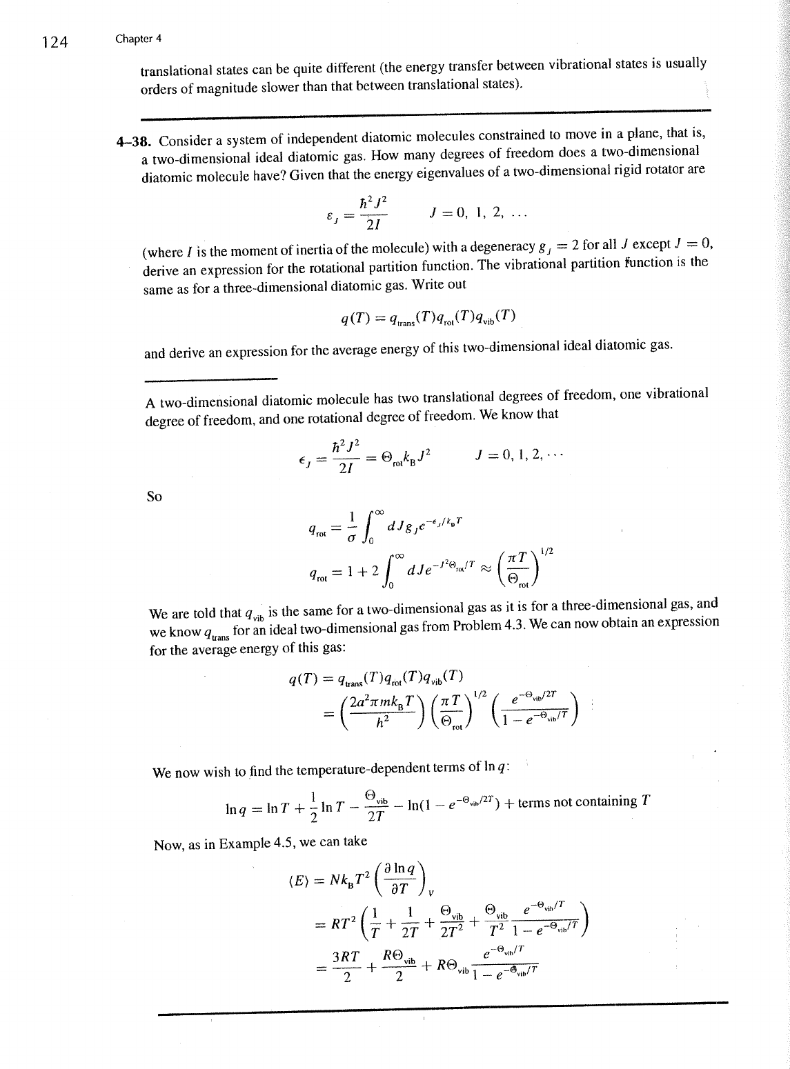 124 Chapter 4 translational states can be quite different (the energy transfer between vibrational states is usually orders of magnitude slower than that between translational states). 4-38. Consider a system of independent diatomic molecules constrained to move in a plane, that is, a two-dimensional ideal diatomic gas. How many degrees of freedom does a two-dimensional diatomic molecule have? Given that the energy eigenvalues of a two-dimensional rigid rotator are (where I is the moment of inertia of the molecule) with a degeneracy = 2 for all J except J = 0, = derive an expression for the rotational partition function. The vibrational partition function is the same as for a three-dimensional diatomic gas. Write out and derive an expression for the average energy of this two-dimensional ideal diatomic gas. A two-dimensional diatomic molecule has two translational degrees of freedom, one vibrational degree of freedom, and one rotational degree of freedom. We know that So We are told that is the same for a two-dimensional gas as it is for a three-dimensional gas, and we know for an ideal two-dimensional gas from Problem 4.3. We can now obtain an expression for the average energy of this gas: = We now wish to find the temperature-dependent terms of In q: In q = In + + terms not containing T Now, as in Example 4.5, we can take = 3RT 2 + RO 2 +
